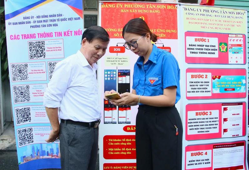 Tình nguyện viên hướng dẫn người dân cài đặt ứng dụng trên điện thoại tại kiot chuyển đổi số.