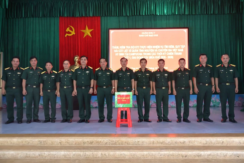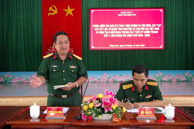 (QK7 Online) – Ngày 30/10, Đoàn công tác Ban Chỉ đạo 515 Quân khu 7 đến thăm, kiểm tra Đội K72 (Bộ CHQS tỉnh Đồng Nai) trước khi lên đường thực hiện nhiệm vụ tìm kiếm, quy tập hài cốt liệt sĩ quân tình nguyện và chuyên gia Việt Nam hy sinh tại Campuchia trong các thời kỳ chiến tranh đợt 1, giai đoạn XXV (mùa khô 2025 – 2026). Đại tá Huỳnh Văn Dũng, Trưởng Phòng Chính sách, Cục Chính trị Quân khu và Đại tá Bùi Văn Sỹ, Phó Chính ủy Bộ CHQS tỉnh Đồng Nai chủ trì thăm, kiểm tra.