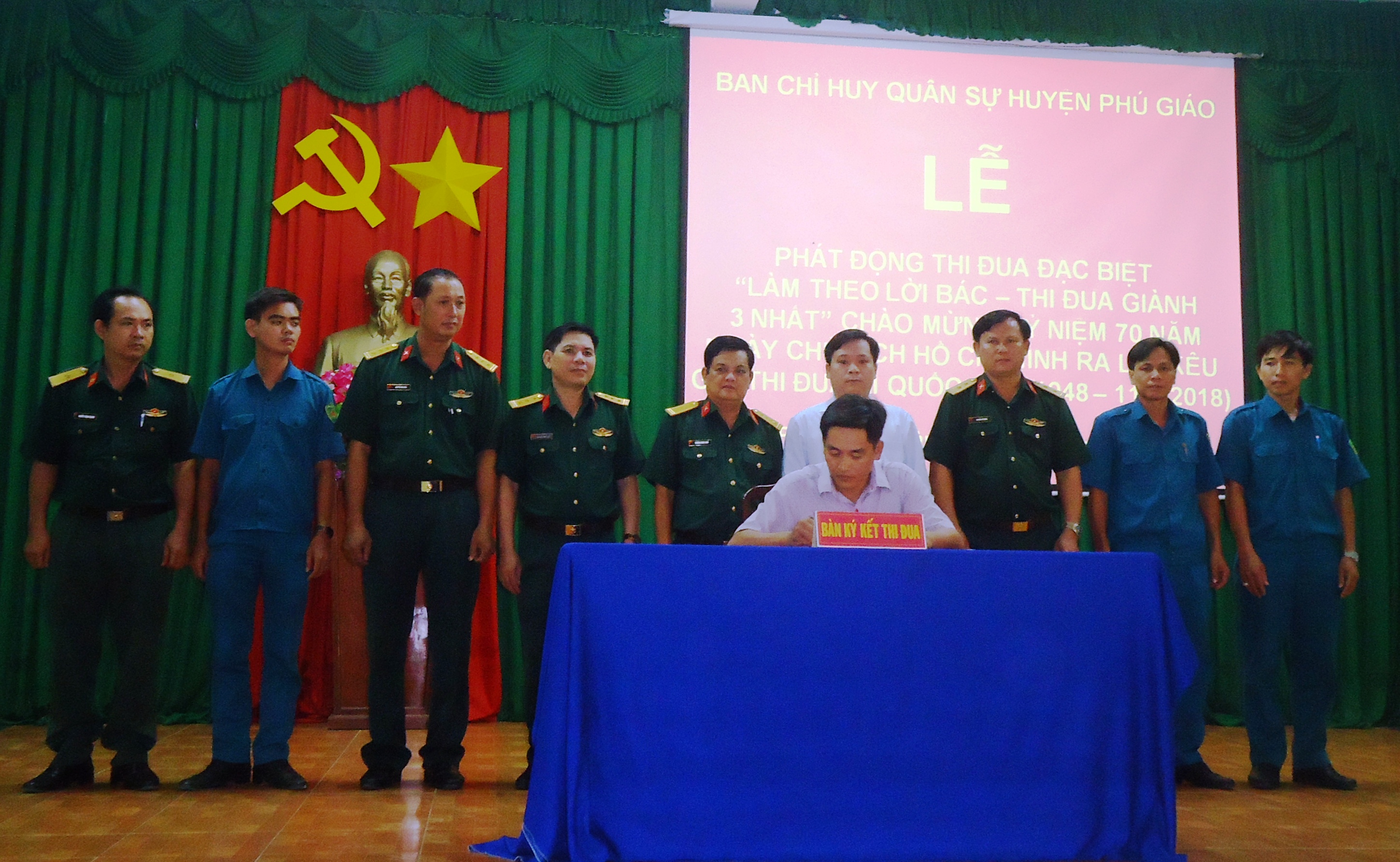 (QK7 Online) - Ngày 9 tháng 5 năm 2018, Ban Chỉ huy quân sự huyện Phú Giáo, tỉnh Bình Dương tổ chức lễ phát động thi đua đặc biệt “Làm theo lời Bác” – thi đua giành 3 nhất chào mừng kỷ niệm 70 năm ngày Chủ tịch Hồ Chí Minh ra lời kêu gọi thi đua ái quốc (11/6/1948 -11/6/2018).
