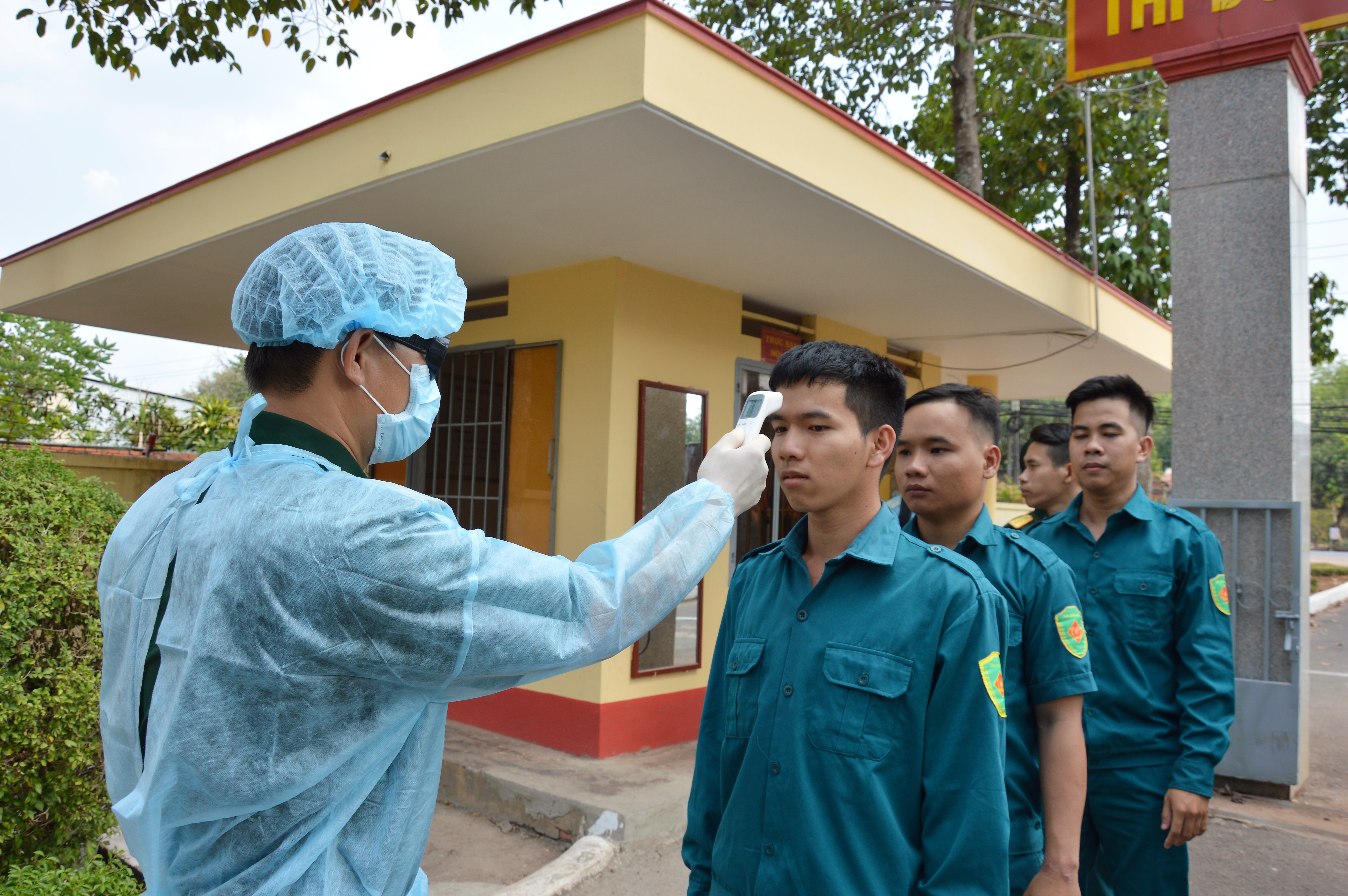 Từ ngày 11-2 thành lập các chốt, tổ kiểm tra thân nhiệt cán bộ, nhân viên, chiến sĩ khi ra vào đơn vị hằng ngày, đặc biệt là tân binh và thân nhân tân binh trong ngày giao - nhận quân (13-2). Thực hiện nghiêm việc khai báo y tế, đo thân nhiệt, phun hóa chất khử trùng phương tiện giao thông và đề nghị đeo khẩu trang y tế đối với cán bộ, chiến sĩ, công dân khi vào đơn vị liên hệ làm việc, công tác.
