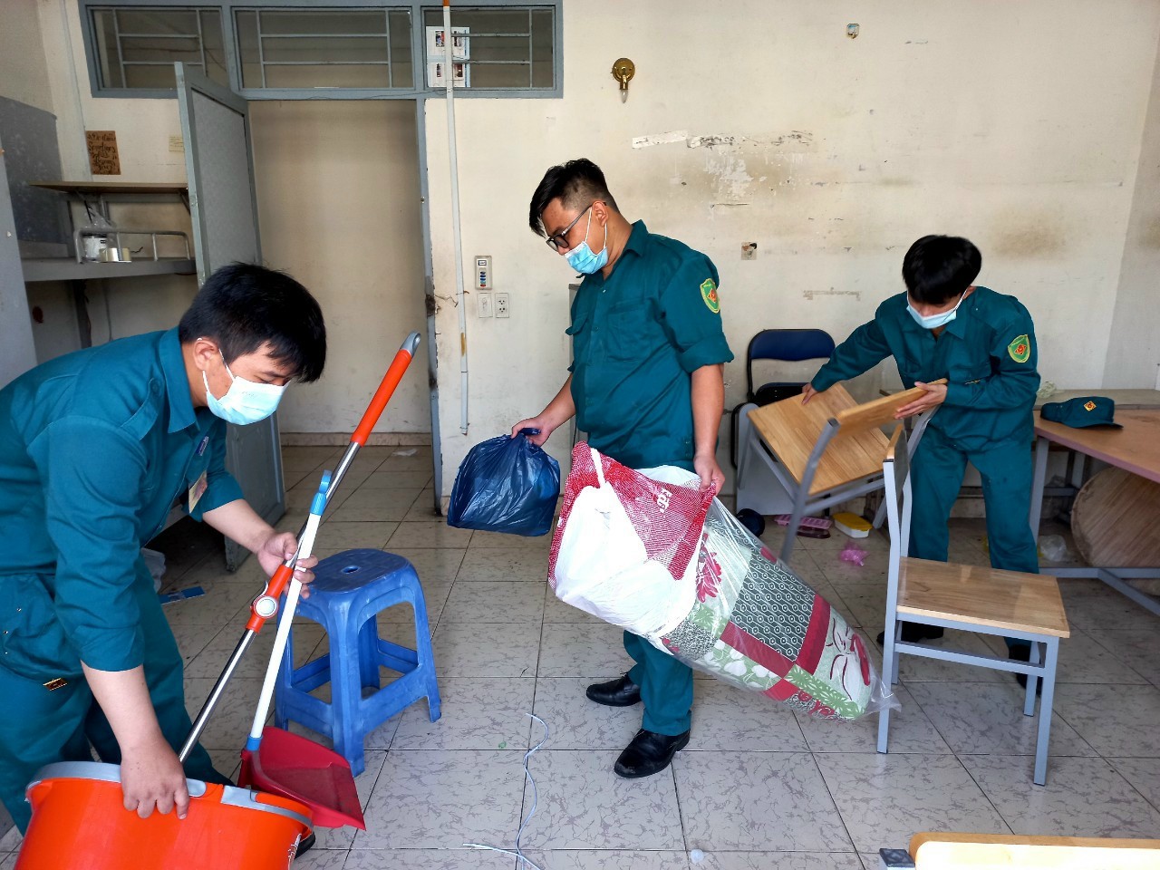 Cán bộ, chiến sĩ LLVT Quận 1 dọn dẹp phòng trong khu vực cách ly tập trung.