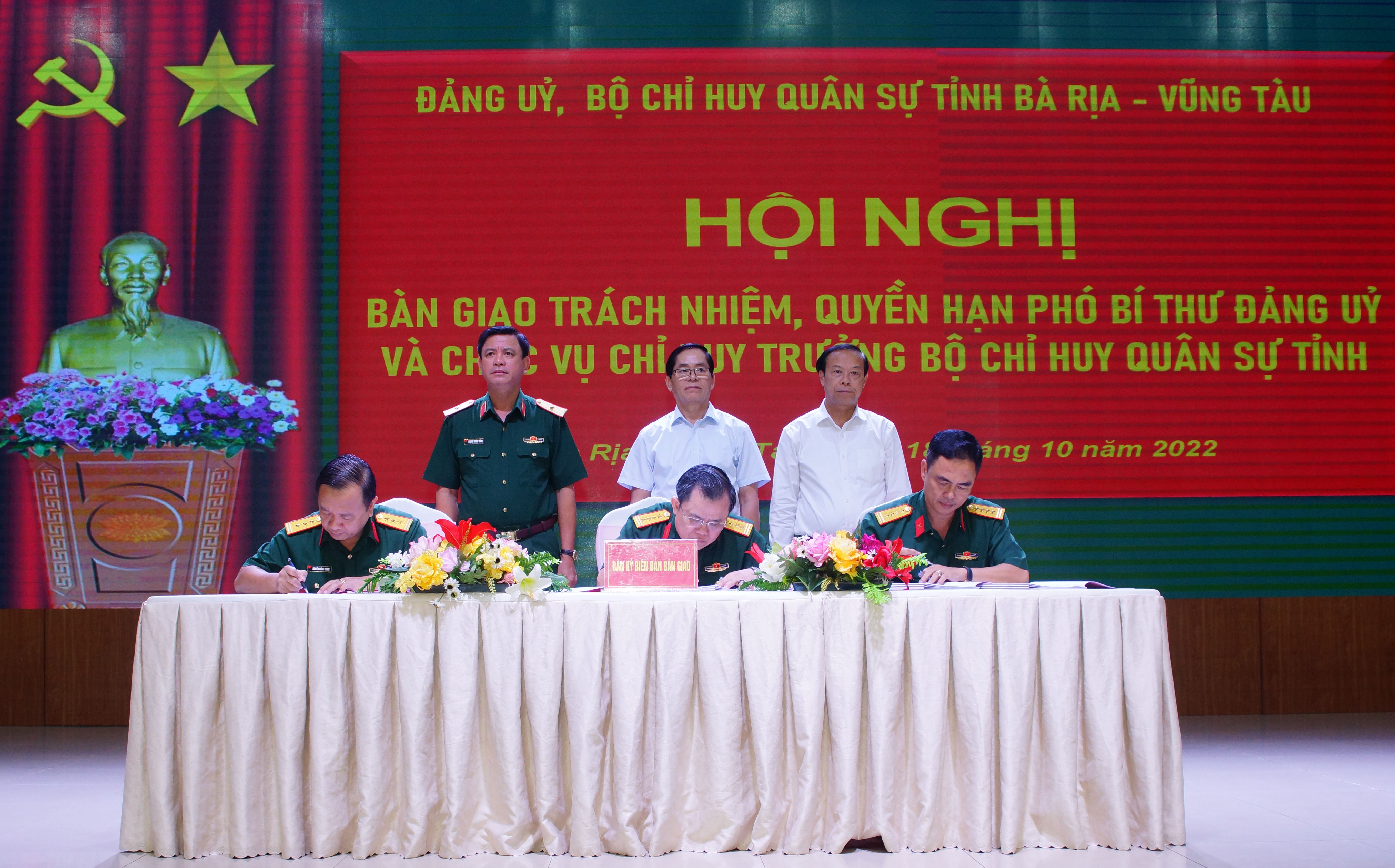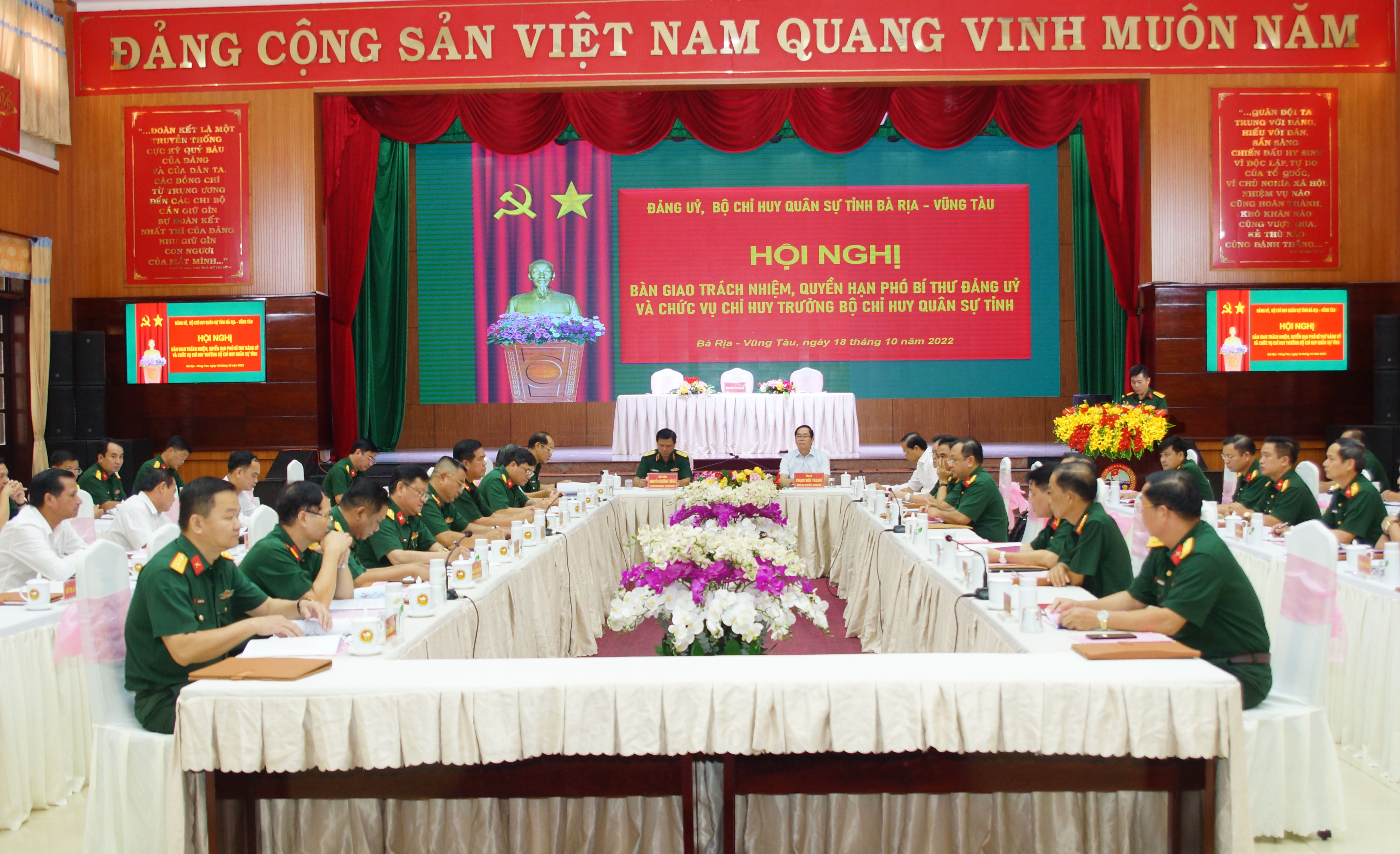 Thực hiện Quyết định số 107, ngày 7/10/2022 của Bộ Quốc phòng về việc Đại tá Nguyễn Tâm Hùng, Chỉ huy trưởng Bộ chỉ huy quân sự tỉnh Bà Rịa – Vũng Tàu nghỉ hưu theo chế độ; Quyết định số 333 của Bộ Quốc phòng bổ nhiệm Đại tá Lê Xuân Bình, Sư đoàn trưởng Sư đoàn 5 giữ chức vụ Chỉ huy trưởng Bộ chỉ huy quân sự tỉnh Bà Rịa – Vũng Tàu, hội nghị đã thông qua biên bản bàn giao trách nhiệm, quyền hạn Phó bí thư Đảng ủy Quân sự tỉnh của Đại tá Nguyễn Tâm Hùng cho Thượng tá Nguyễn Thành Trung, Phó Bí thư Thường trực Đảng ủy Quân sự, Chính ủy Bộ chỉ huy quân sự tỉnh; bàn giao chức vụ chỉ huy trưởng Bộ chỉ huy quân sự tỉnh cho Đại tá Lê Xuân Bình. Nội dung bàn giao gồm: tổ chức biên chế, quân số, tổ chức Đảng, đảng viên; cơ sở vật chất doanh trại, hậu cần, tài chính ngân sách; vũ khí trang bị kỹ thuật. Kết quả thực hiện nhiệm vụ của lực lượng vũ trang tỉnh trong 9 tháng qua, các nhiệm vụ cần tập trung lãnh đạo, chỉ đạo triển khai trong quý IV và những nhiệm vụ chính trị trọng tâm cuối năm 2022.