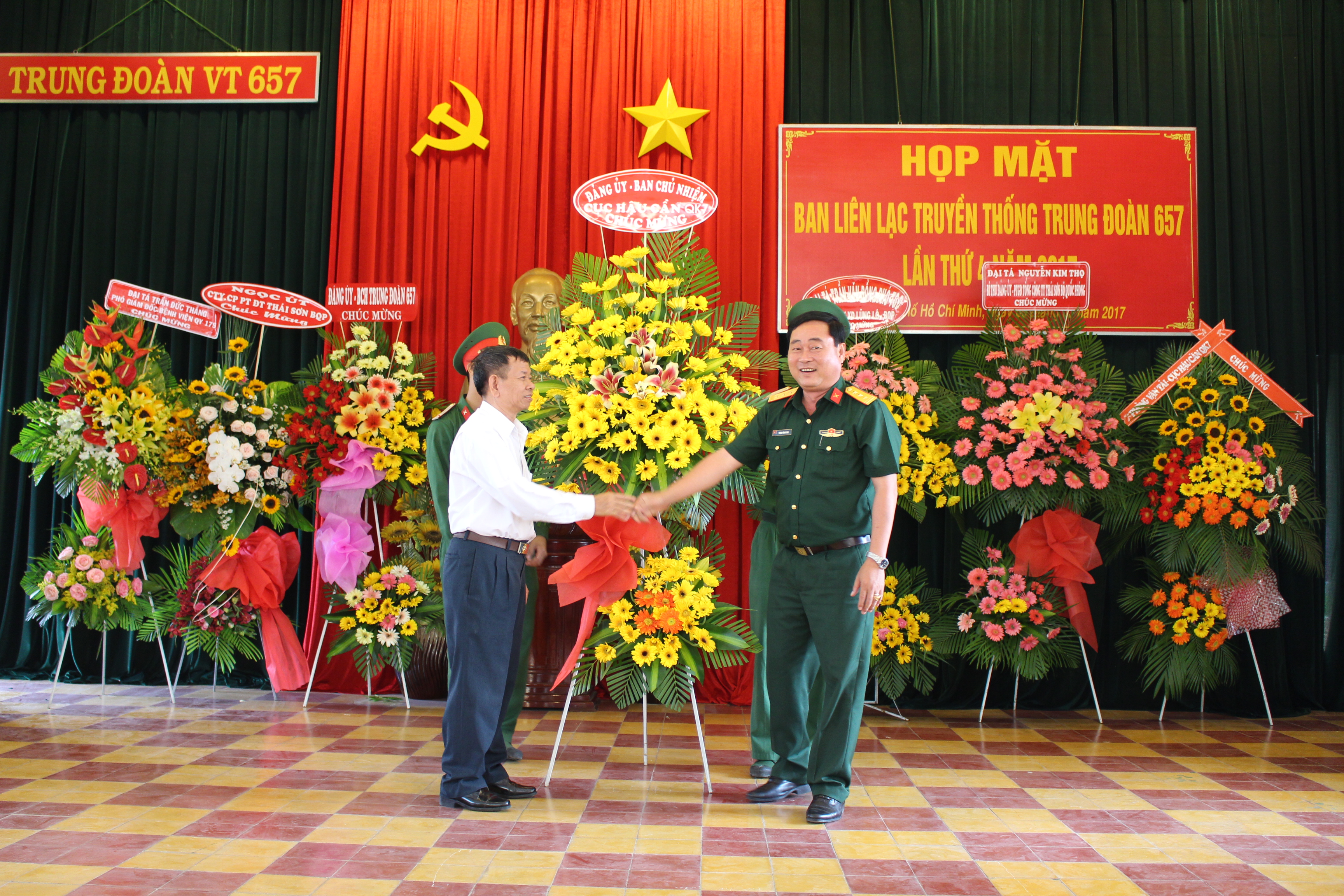Thượng tá Trịnh Văn Minh, Chính ủy trung đoàn tặng hoa của Thủ trưởng Cục Hậu cần cho Ban Liên lạc Trung đoàn 657