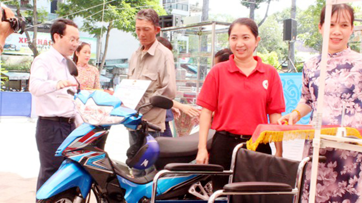 trao phương tiện sinh kế là chiếc xe máy cho người dân khó khăn.