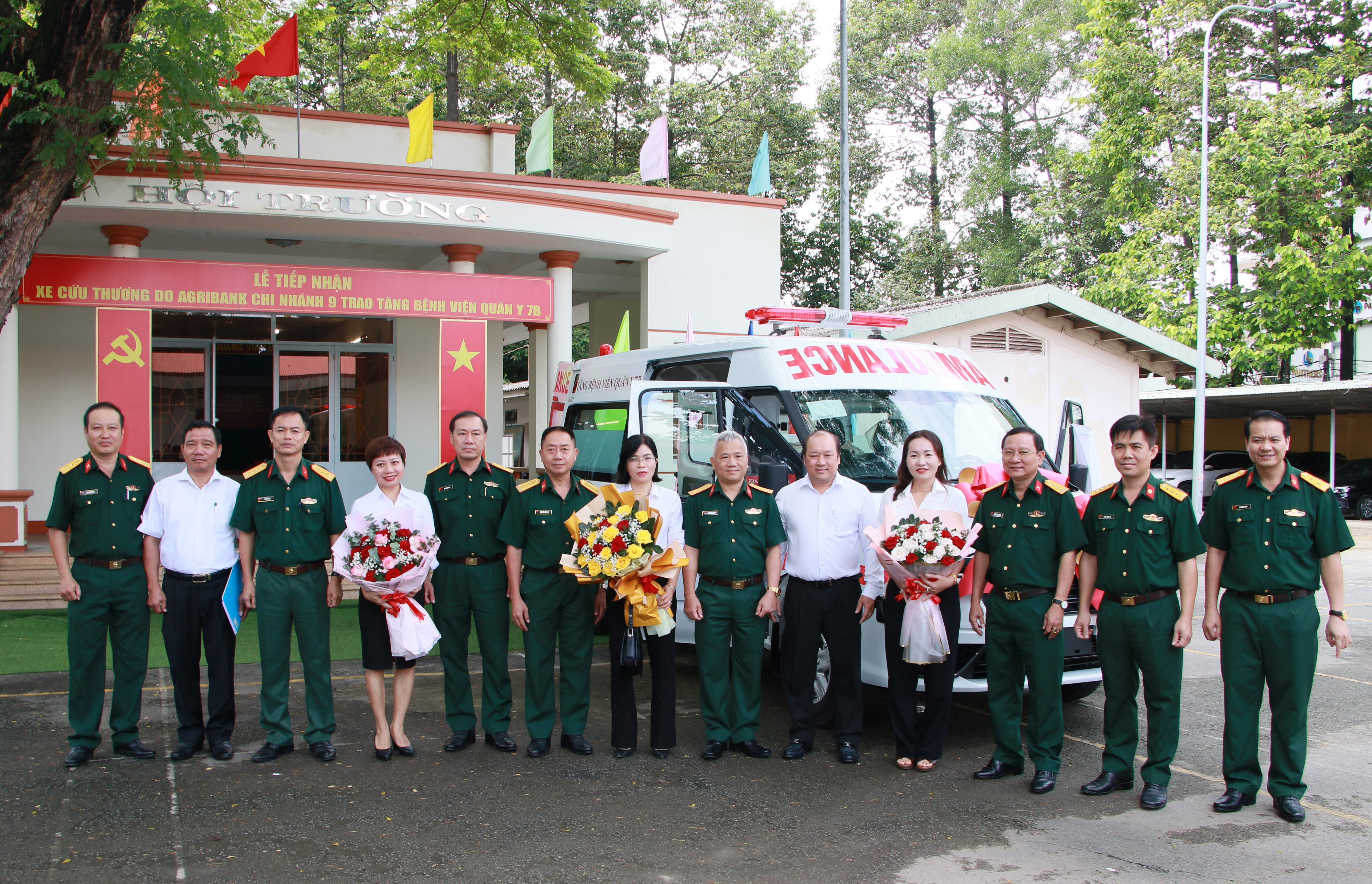 (QK7 Online) - Sáng 25-7, Bệnh viện Quân y 7B tổ chức tiếp nhận xe ô tô cứu thương do Ngân hàng Agribank chi nhánh 9 trao tặng. Tham dự lễ có Đại tá Huỳnh Văn Mầm, Chính ủy Cục Hậu cần Quân khu; Đại tá Nguyễn Tuấn, Giám đốc Bệnh viện Quân y 7B; Ban Giám đốc Ngân hàng Agribank và đại diện Sở y tế tỉnh Đồng Nai.
