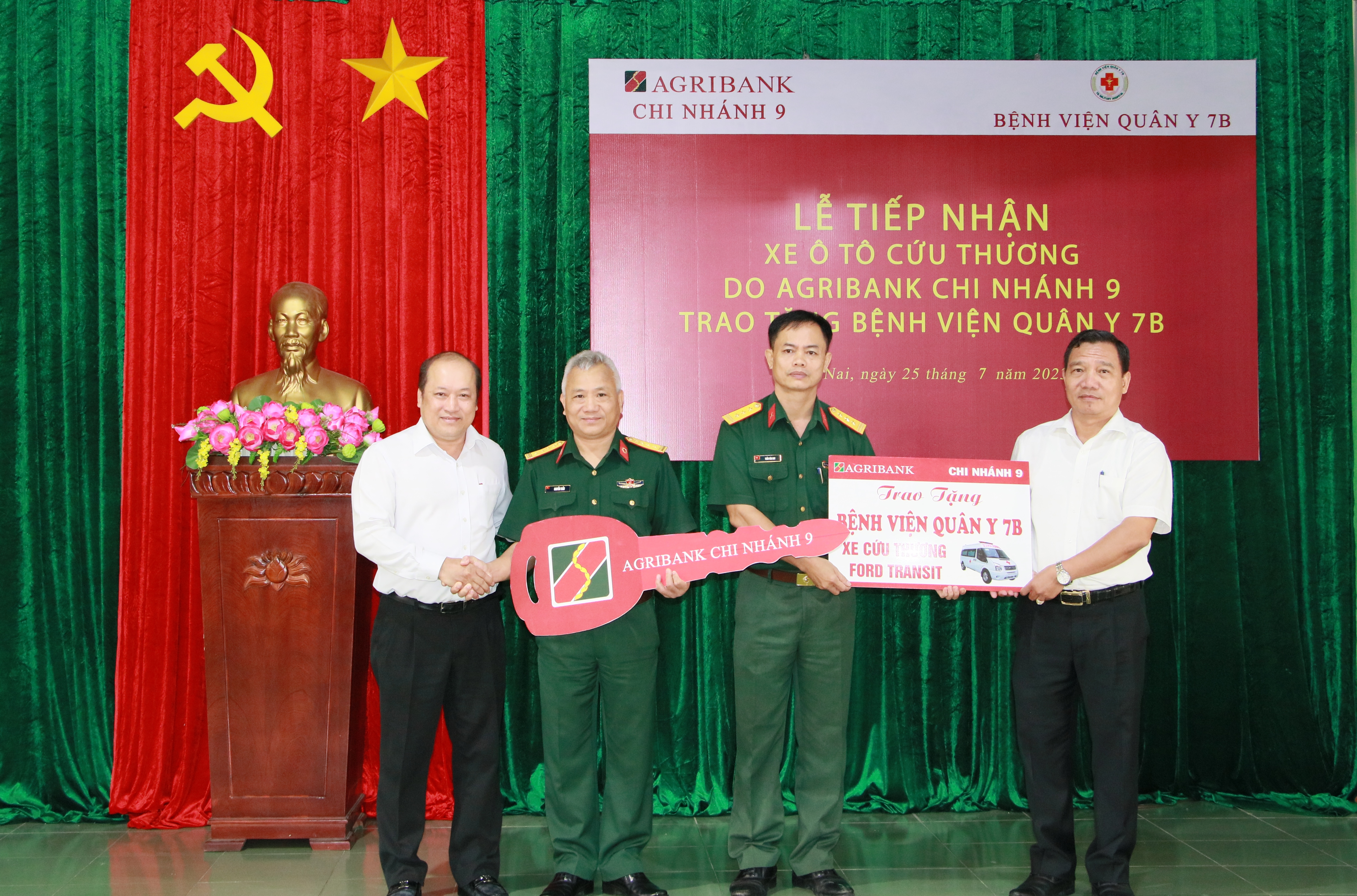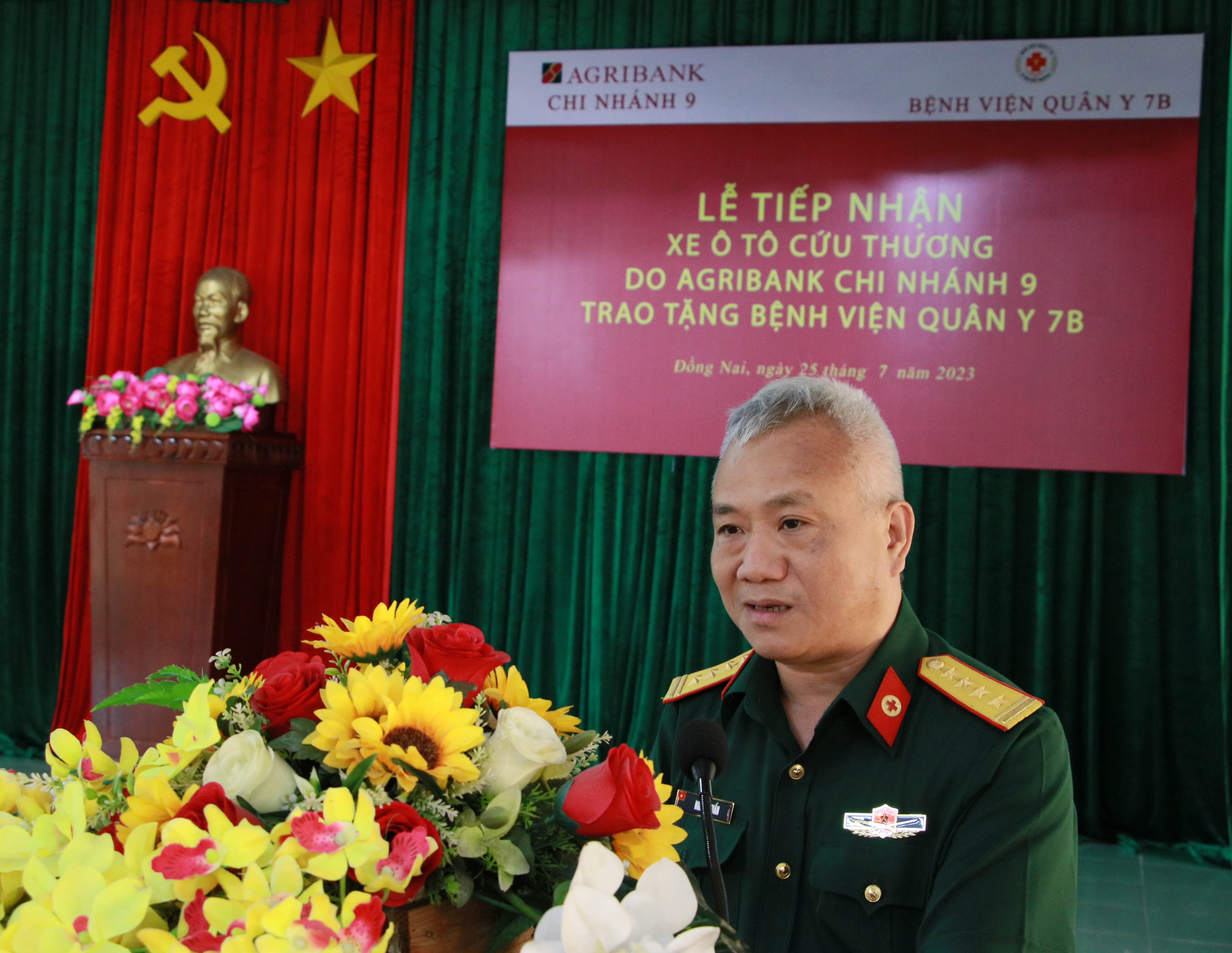 Phát biểu tại buổi lễ, ông Trần Trung Định, Giám đốc Ngân hàng Agribank chi nhánh 9 chia sẻ: "Đây là chuỗi hoạt động đảm bảo an sinh xã hội, hướng tới sự phát triển cộng đồng của ngân hàng; hôm nay Ngân hàng Agribank chi nhánh 9 tặng xe cứu thương cho Bệnh viện Quân y 7B nhằm giúp đỡ bệnh viện có thêm phương tiện vận chuyển bệnh nhân, tăng cường khả năng cơ động, hỗ trợ Nhân dân trên địa bàn và xử trí các tình huống thiên tai, dịch bệnh; góp phần hoàn thành xuất sắc các nhiệm vụ được giao, thắt chặt mối quan hệ giữa Ngân hàng Agribank và bệnh viện ngày càng tốt đẹp."