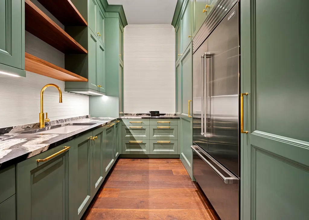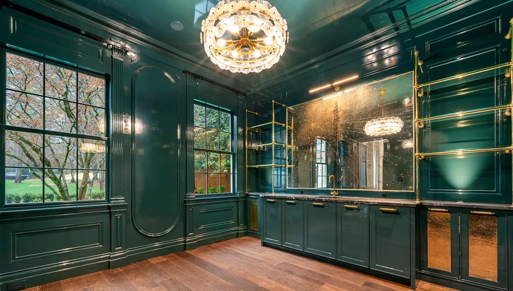 Quầy bar được hoàn thiện với lớp sơn màu xanh lá bóng.