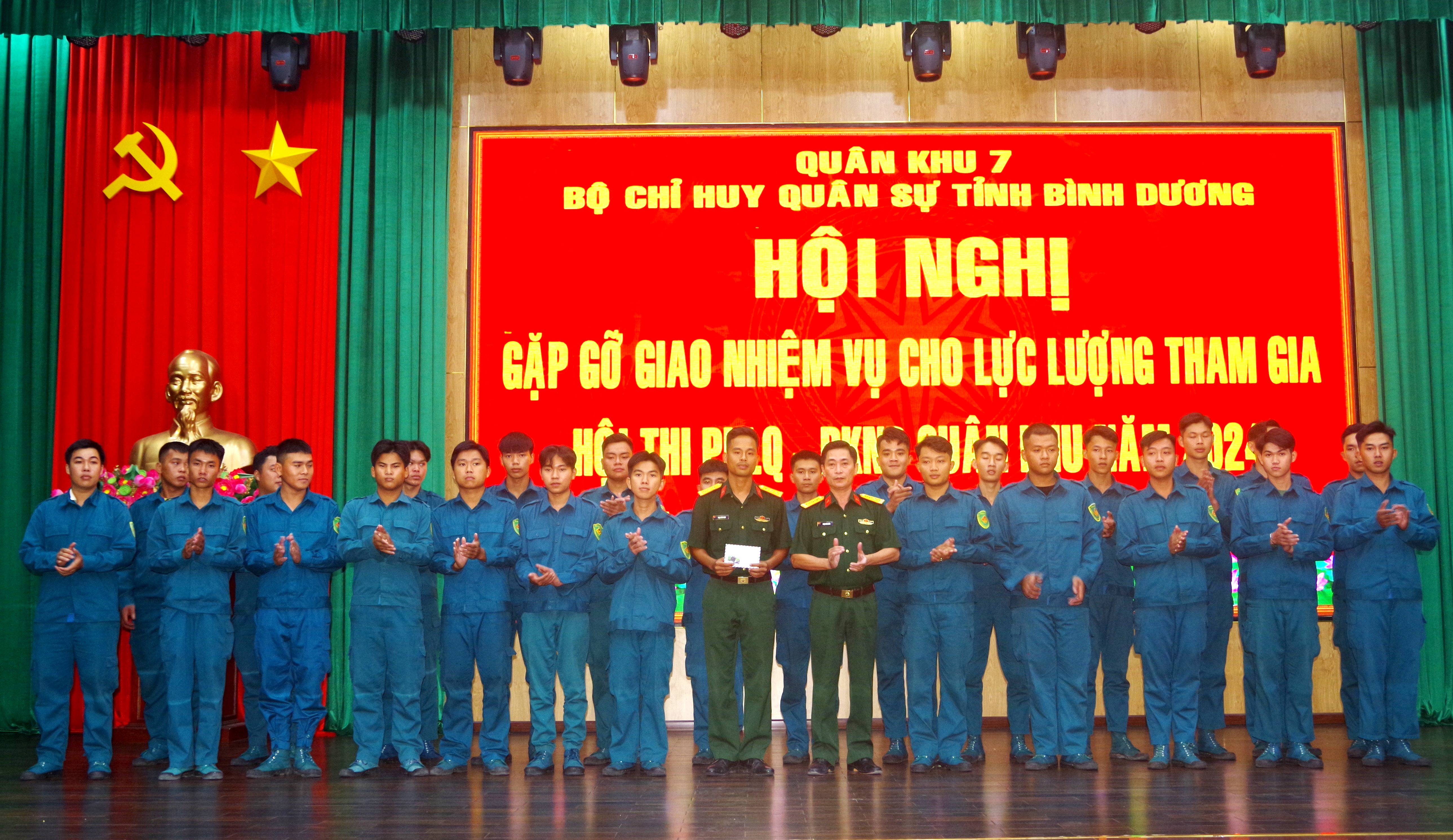 Đại tá Phạm Văn Kiên, Phó Chỉ huy trưởng, Tham mưu trưởng Bộ CHQS tỉnh Bình Dương tặng quà động viên lực lượng tham gia Hội thi.