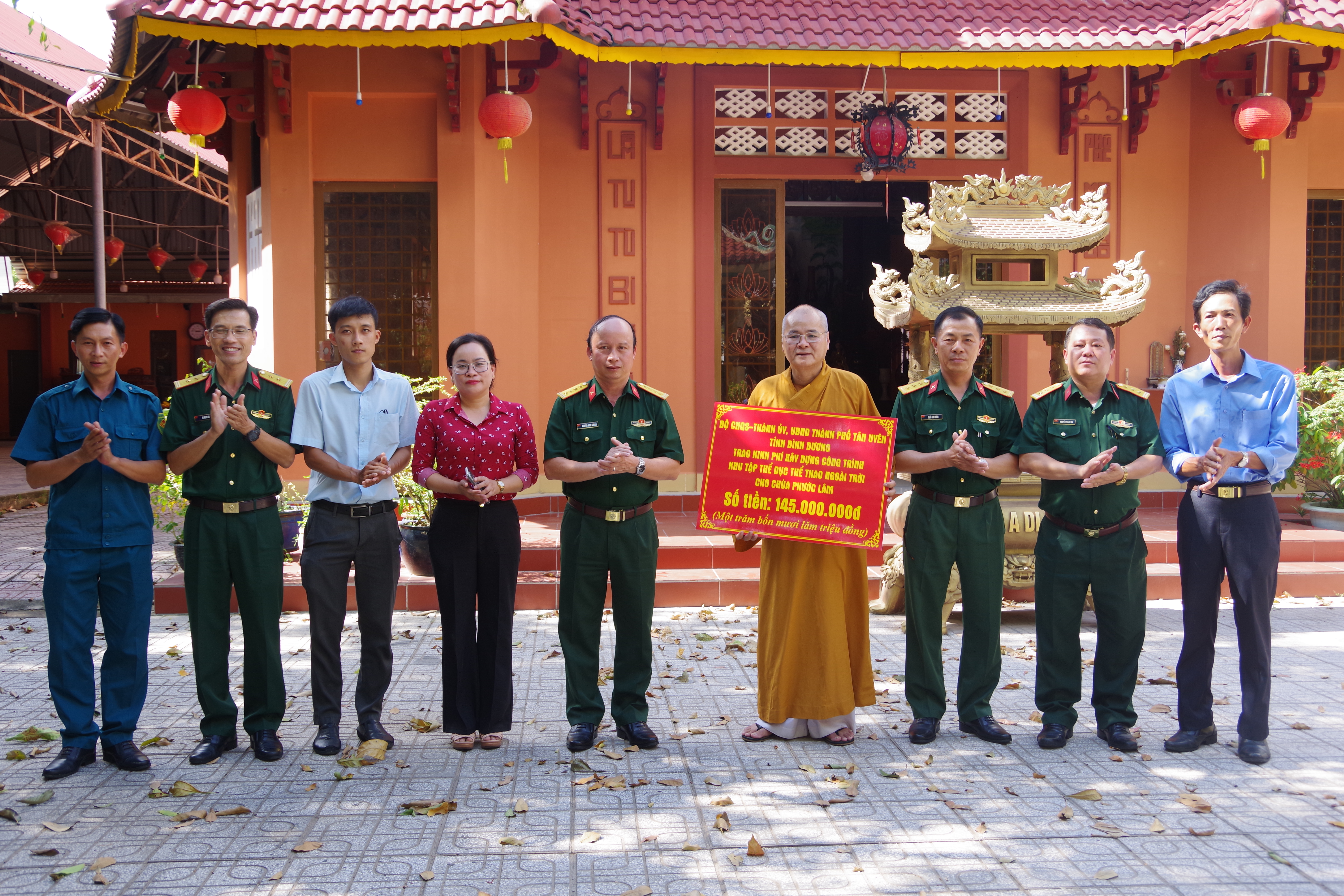 (QK7 Online) - Thực hiện chủ trương “Tăng cường gắn kết thân thiện, hỗ trợ, giúp đỡ đồng bào dân tộc, tôn giáo” của Đảng ủy, Bộ Tư lệnh Quân khu giai đoạn 2021-2025, Bộ CHQS tỉnh Bình Dương vừa trao 145 triệu đồng cho Chùa Phước Lâm để xây dựng công trình tập thể dục thể thao ngoài trời.