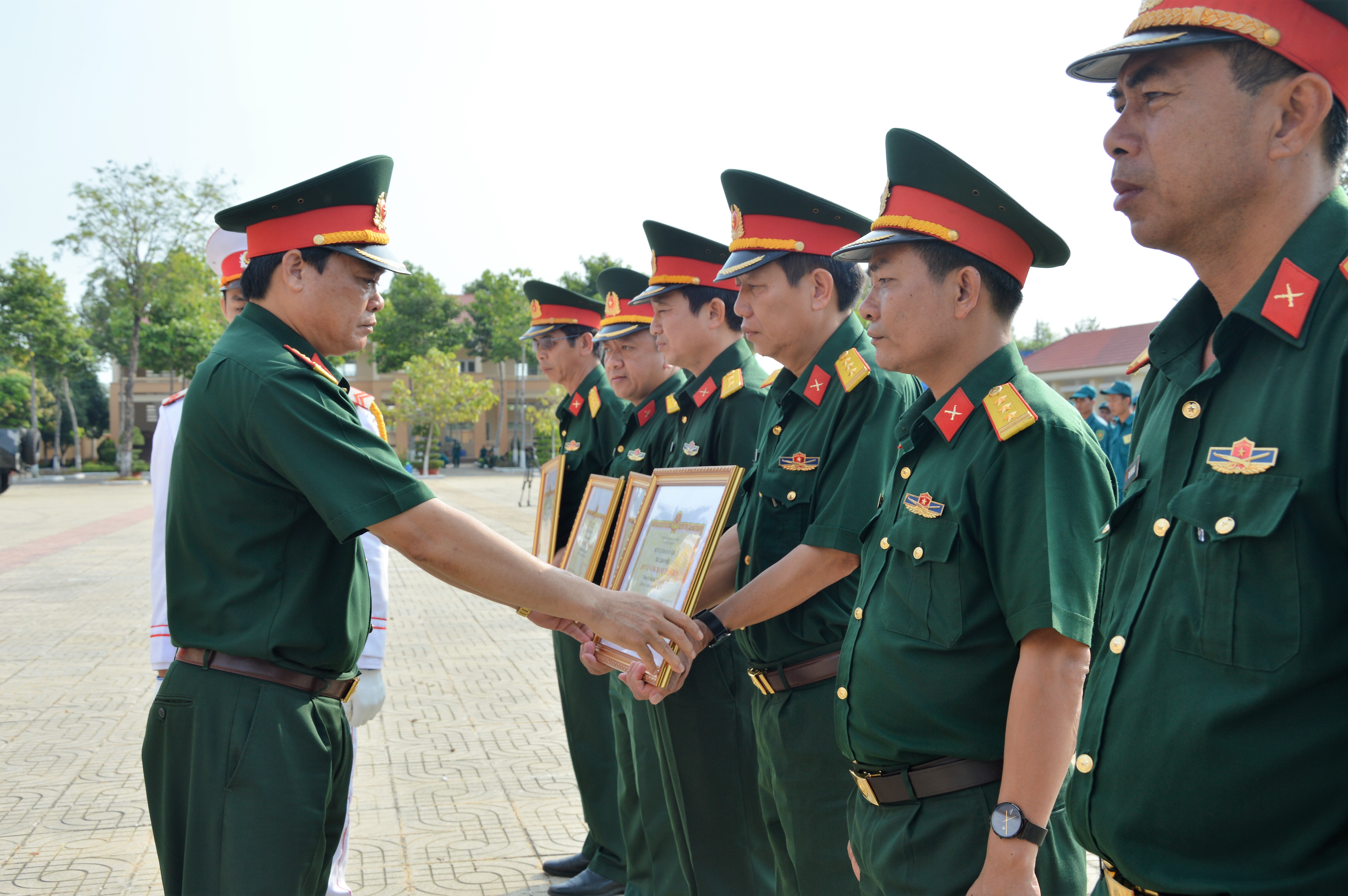 Đại tá Phạm Phú Ý - Chỉ huy trưởng Bộ CHQS tỉnh trao khen thưởng cho các đơn vị đạt kết quả cao trong xây dựng đơn vị VMTD năm 2018.