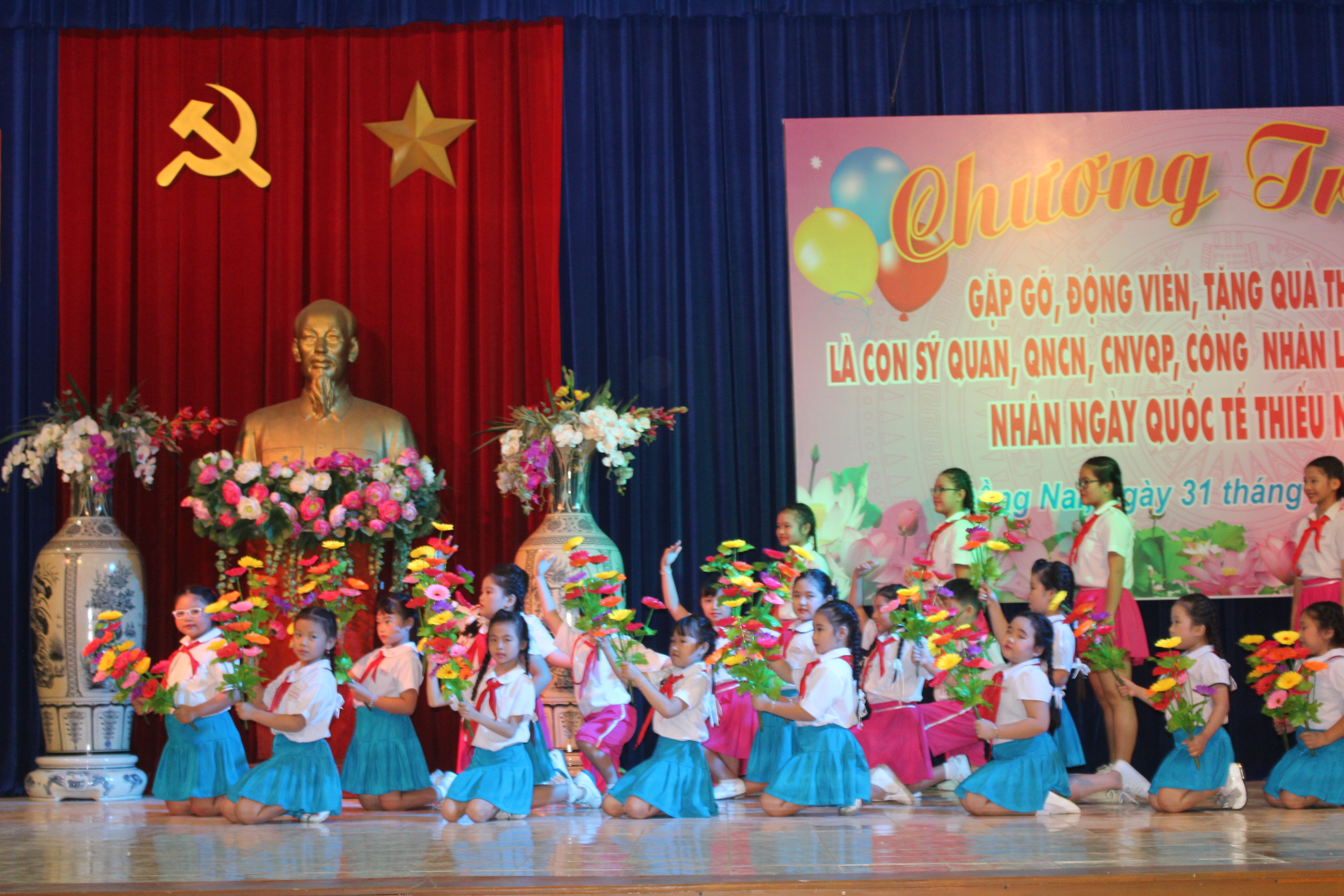 (QK7 Online) - Tối 31-5, Bộ CHQS tỉnh tổ chức chương trình gặp gỡ, động viên và tặng quà cho 467 thiếu nhi là con của sĩ quan, quân nhân chuyên nghiệp, công nhân viên quốc phòng, công nhân lao động hợp đồng nhân ngày Quốc tế Thiếu nhi 1-6. Phó chính ủy Bộ CHQS tỉnh, Đại tá Trần Văn Khương và bố mẹ các cháu thiếu nhi đang công tác trong lực lượng vũ trang tỉnh đến dự.