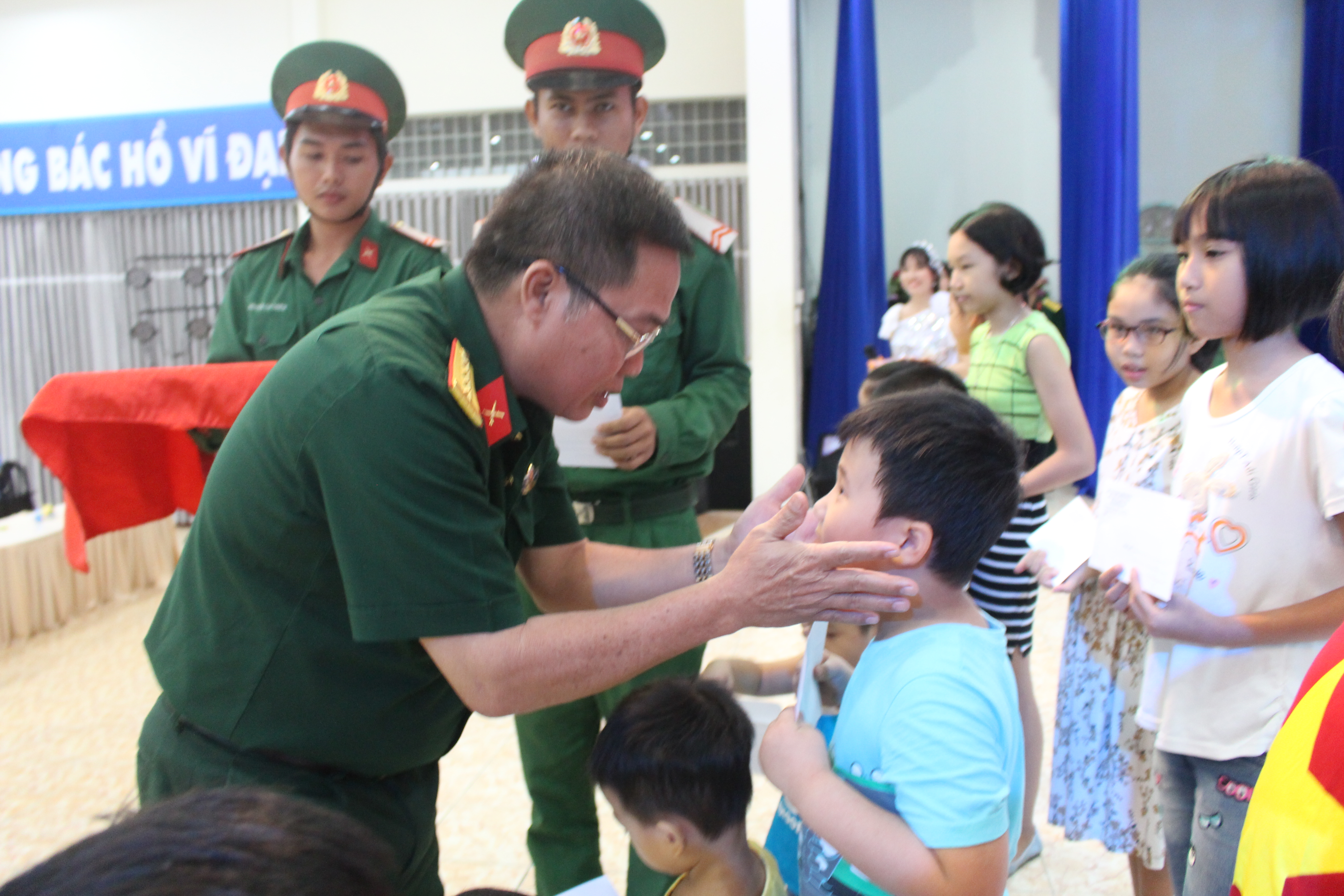 Đại tá Trần Văn Khương, Phó chính ủy Bộ CHQS tỉnh tặng quà, động viên  các cháu thiếu nhi.