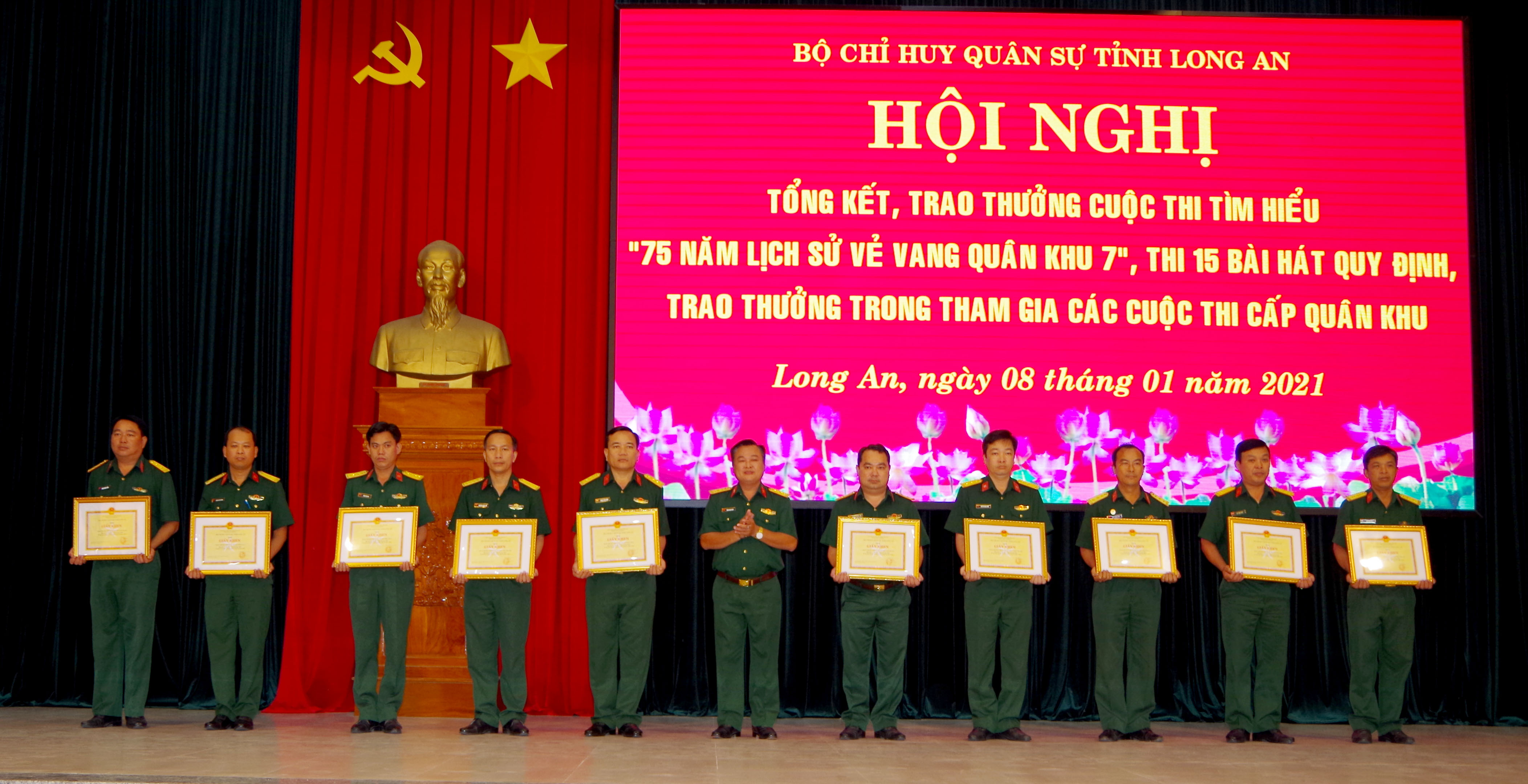 Dịp này, thừa ủy quyền của Bộ Tư lệnh Quân khu, Bộ CHQS tỉnh trao bằng khen cho Bộ CHQS tỉnh đạt giải nhất trong cuộc thi tìm hiểu “75 năm lịch sử vẻ vang Quân khu 7”, trao giải nhất, nhì, ba và giải khuyến khích cho 8 cá nhân đạt kết quả cao trong hội thi ảnh, sáng tác nhạc, thi tìm hiểu “75 năm lịch sử vẻ vang Quân khu 7”.