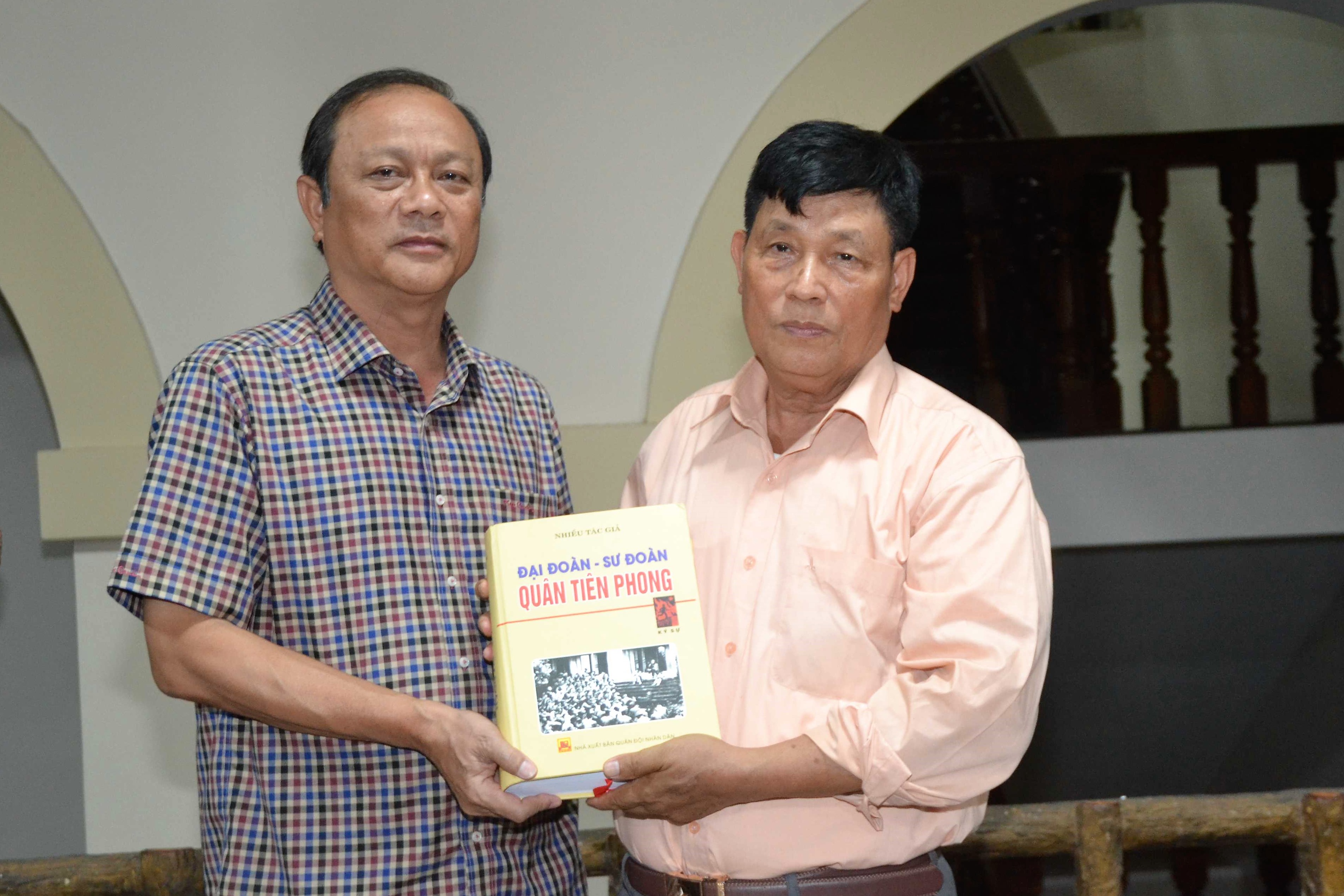 Trung tướng Ngô Lương Hạnh (bên phải) - Trưởng đoàn cựu chiến binh Sư đoàn 308, Đại đoàn Quân tiên phong tặng quà lưu niệm cho Bộ CHQS tỉnh.