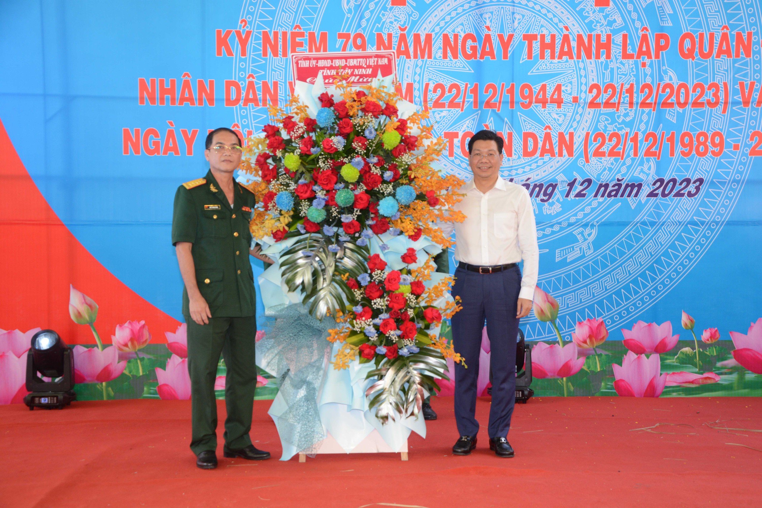 Phó Bí thư Tỉnh ủy Tây Ninh Nguyễn Mạnh Hùng tặng hoa chúc mừng cán bộ, chiến sĩ LLVT tỉnh nhân kỷ niệm 79 năm Ngày thành lập Quân đội nhân dân Việt Nam.