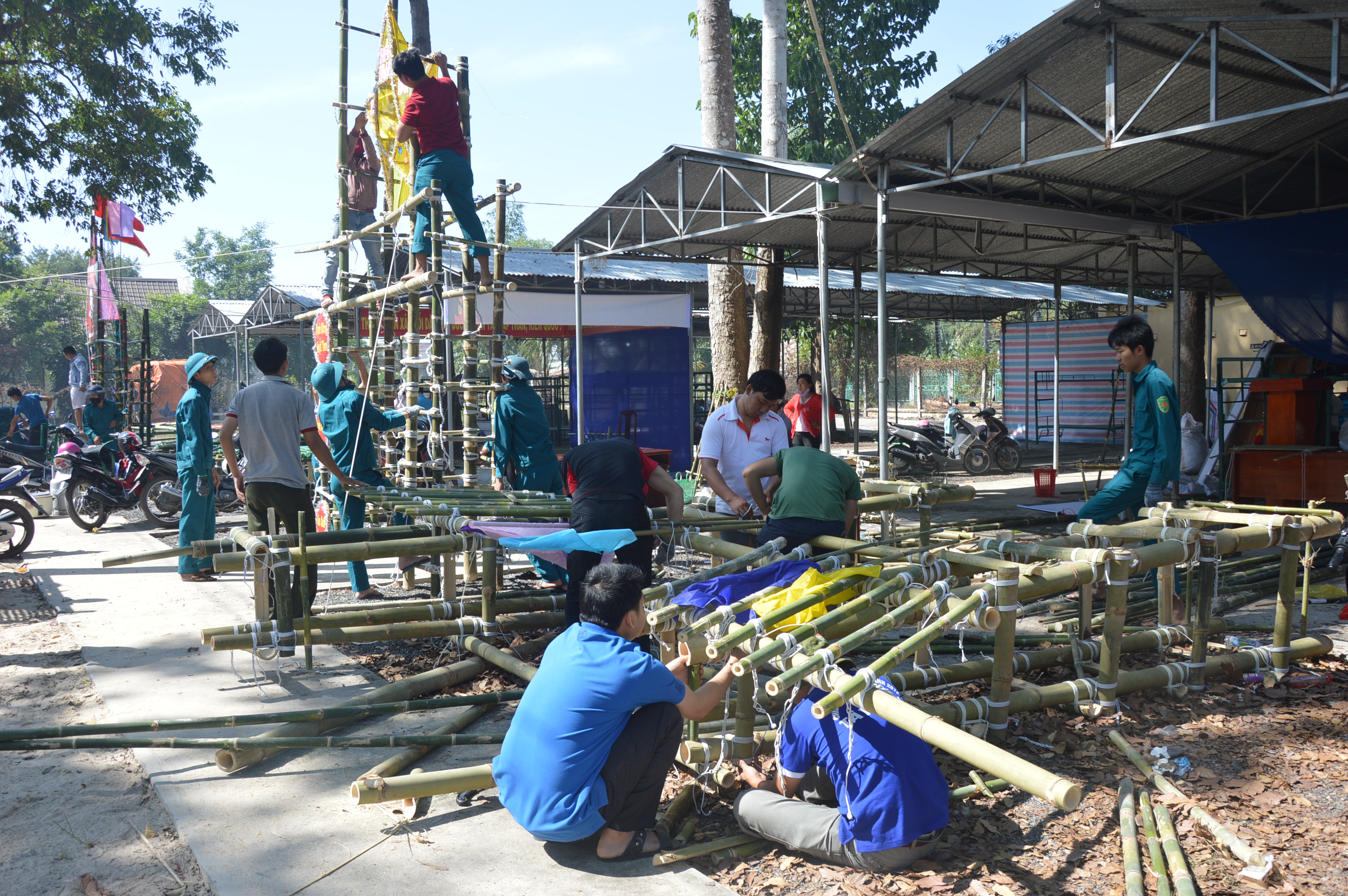 Đoàn viên thanh niên địa phương tham gia dựng trại chuẩn bị hội trại tòng quân huyện Tân Châu