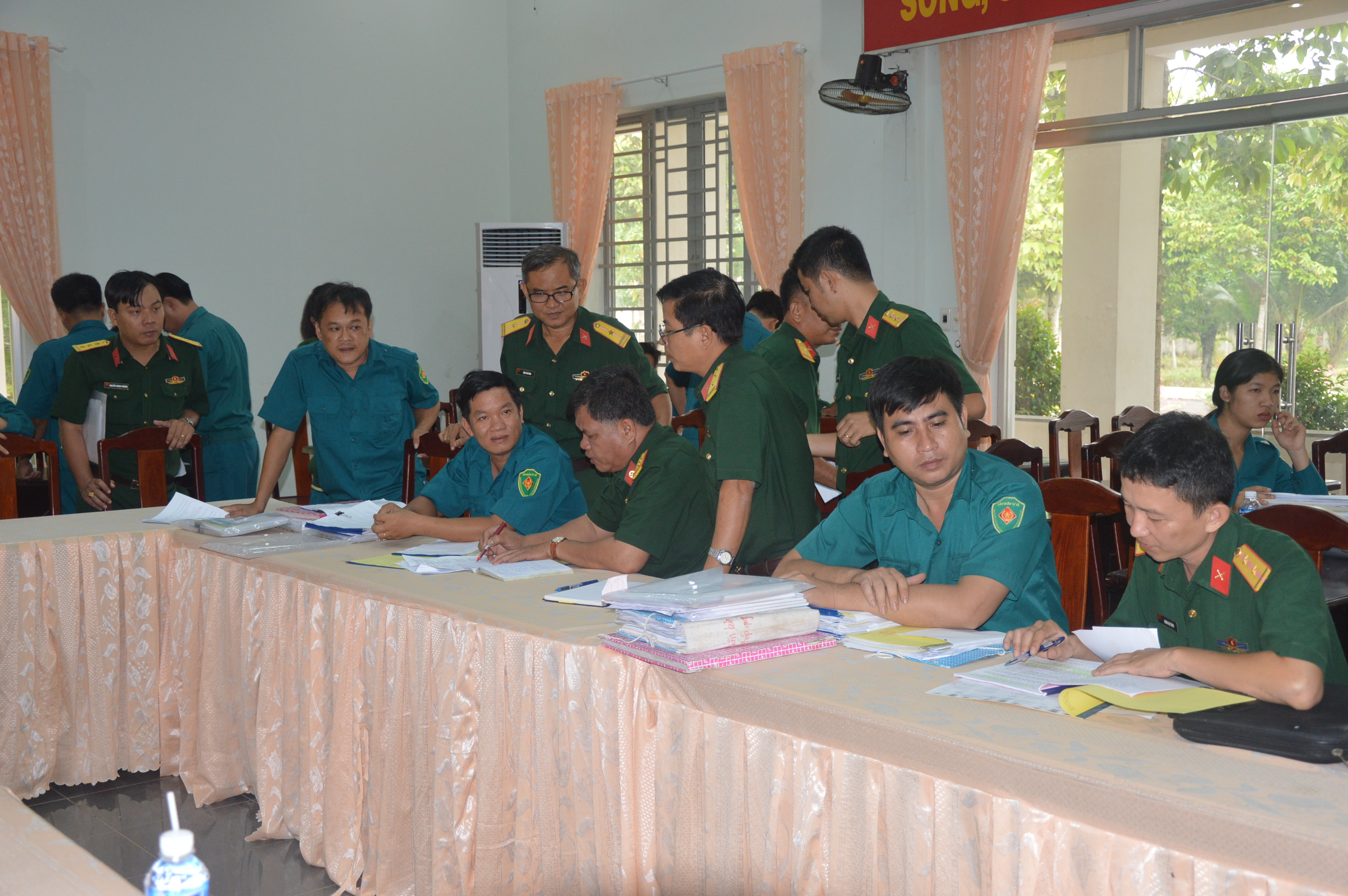 Các thành viên đoàn kiểm tra của Bộ chỉ huy quân sự tỉnh kiểm tra hồ sơ tuyển quân của Hội đồng Nghĩa vụ quân sự các xã, phường, thị trấn tại Ban chỉ huy quân sự huyện Hòa Thành
