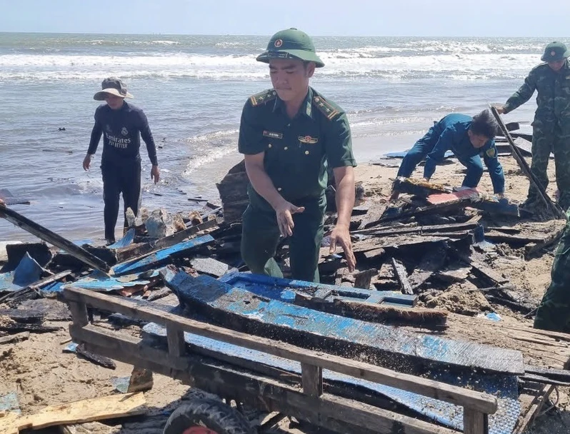 Cán bộ, chiến sĩ Đồn Biên phòng Phước Thuận tích cực thu dọn phần thân tàu bị tháo dỡ tại bờ biển.
