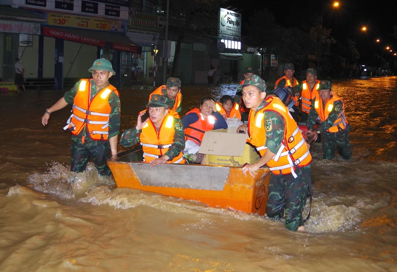 Trong đêm tối, cán bộ, chiến sĩ Lữ đoàn Công binh 25, Quân khu 7 hỗ trợ người dân sơ tán đến nơi an toàn.