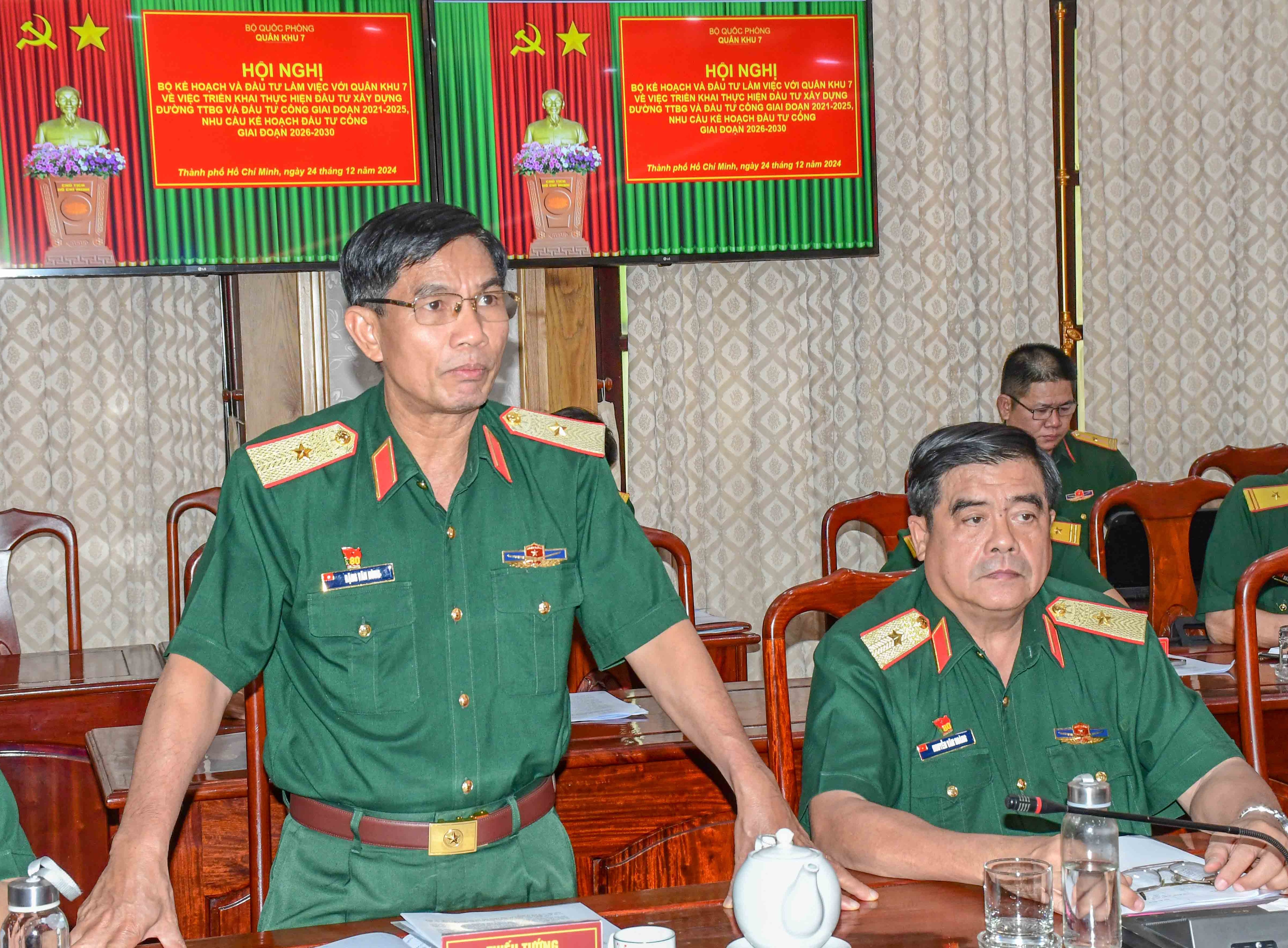 Về công tác đầu tư công giai đoạn 2021 – 2025, nhu cầu kế hoạch đầu tư công giai đoạn 2026 – 2030, đồng chí trưởng đoàn ghi nhận Quân khu 7 đã triển khai cho các cơ quan, đơn vị, địa phương kế hoạch đầu tư XDCB năm 2024 bao gồm cả vốn NSNN và vốn chi thường xuyên cho quốc phòng. Tiến độ thực hiện đảm bảo yêu cầu, chủ đầu tư và nhà thầu thi công đã phối hợp các giải pháp hữu hiệu để đầy nhanh tiến độ thi công. Công tác giải ngân, tạm ứng hợp đồng, thanh toán khối lượng hoàn thành thực hiện đúng nguyên tắc quy định.