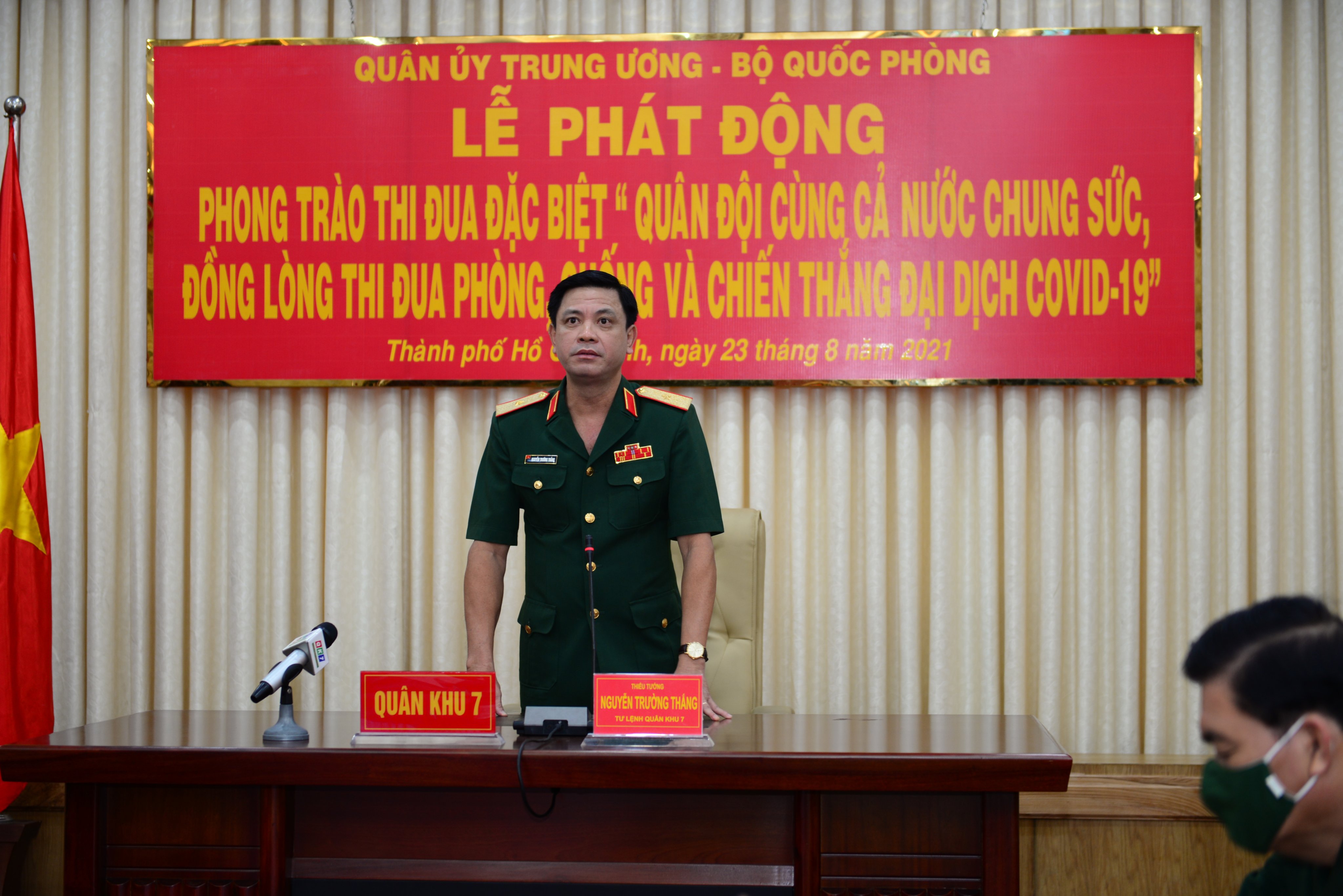 Thay mặt các cơ quan, đơn vị trong toàn quân phát biểu hưởng ứng phong trào thi đua, Thiếu tướng Nguyễn Trường Thắng, Tư lệnh Quân khu 7 nêu rõ: Cán bộ, chiến sĩ LLVT Quân khu thấu suốt quan điểm “chống dịch như chống giặc”, “sức khỏe, tính mạng của Nhân dân là trên hết, trước hết”. Luôn nêu cao tinh thần ở đâu gian khổ khó khăn, ở đó có bộ đội; triển khai quyết liệt, đồng bộ, thực hiện nghiêm ngặt các biện pháp phòng, chống dịch, mở rộng vùng xanh, thu hẹp vùng đỏ và tiến tới xanh hoá vùng đỏ; đồng thời, tham gia hiệu quả việc cứu đói, cứu đau, quyết không để dân đói khổ, thiếu thốn, khó khăn, không để sức khoẻ và tính mạng của dân bị đe doạ trong đại dịch.