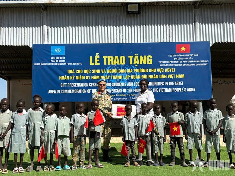 Đội Công binh số 4 Việt Nam tổ chức chương trình trao quà tặng người dân và các em nhỏ tại khuôn viên Nhà thờ Catholic và các khu dân cư lân cận thuộc Phái bộ An ninh Lâm thời Liên hợp quốc ở khu vực Abyei (UNISFA). Ảnh: QĐND