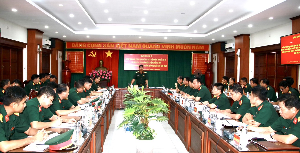 (QK7 Online) - Ngày 17/5, đoàn công tác Bộ Tham mưu Quân khu 7 do Thiếu tướng Lê Ngọc Hải, Phó Tham mưu trưởng Quân khu làm trưởng đoàn tiến hành kiểm tra khắc phục hạn chế sau kết luận kiểm tra của Bộ Tổng Tham mưu (BTTM) về kết quả huấn luyện chiến sĩ mới (CSM) và huấn luyện giai đoạn 1 năm 2023 tại Trường Quân sự Quân khu 7.