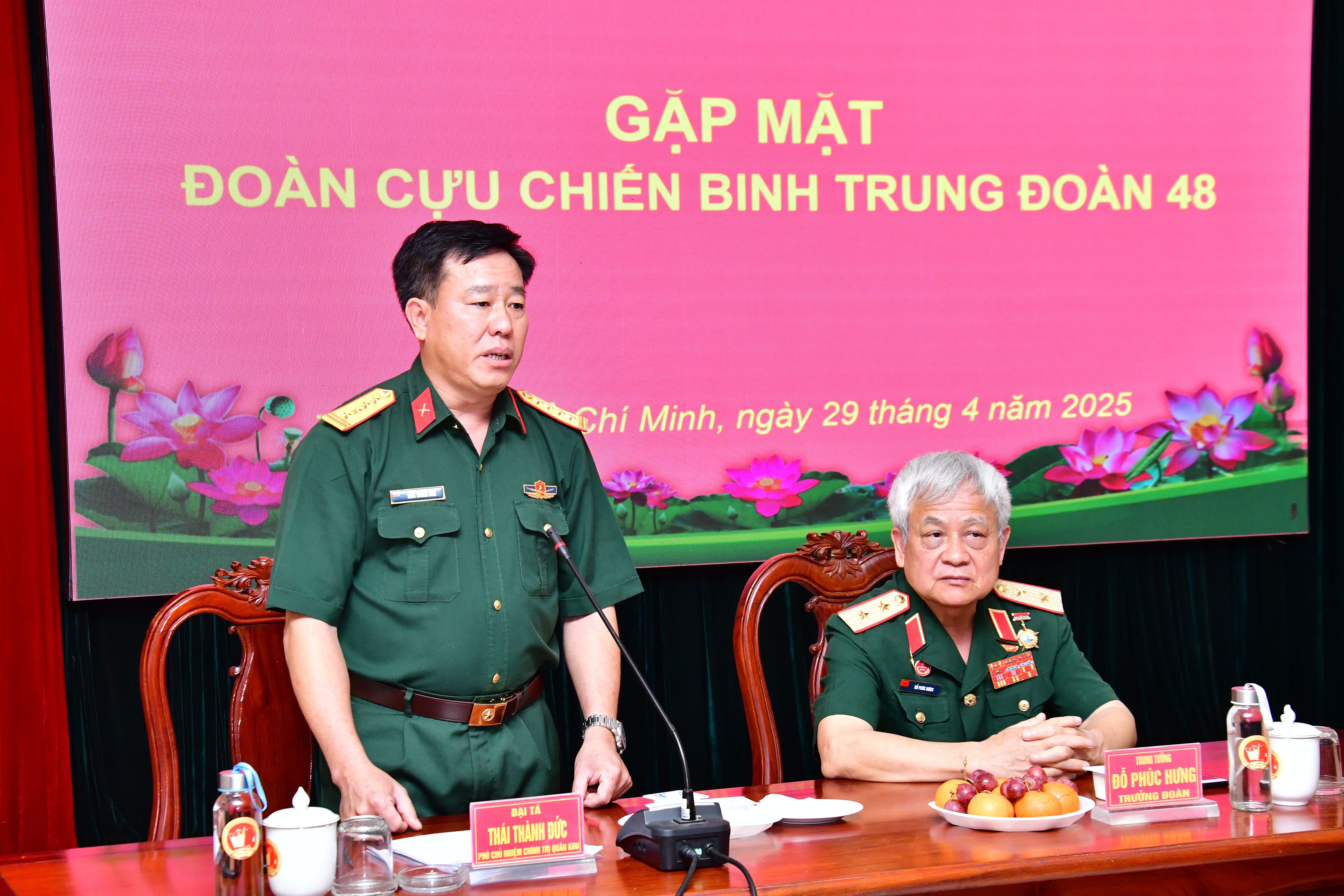 Thừa ủy quyền thủ trưởng Bộ Tư lệnh Quân khu, Đại tá Thái Thành Đức, Phó Chủ nhiệm Chính trị Quân khu vui mừng chào đón đoàn Cựu chiến binh Trung đoàn 48 về thăm lại chiến trường xưa. Đồng thời bày tỏ, LLVT Quân khu 7 luôn trân trọng và biết ơn sâu sắc những công lao, thành tích của các thế hệ đi trước đã cống hiến, hy sinh cho sự nghiệp đấu tranh giải phóng dân tộc, thống nhất đất nước; trong đó có sự đóng góp to lớn của Trung đoàn 48, Sư đoàn 320B là đơn vị được giao nhiệm vụ đánh chiếm và cấm cờ trên nốc Bộ Tổng tham mưu Ngụy, đập tan toàn bộ hệ thống kìm kẹp của đế quốc Mỹ và chính quyền Sài Gòn, giải phóng hoàn toàn miền Nam, thống nhất đất nước.