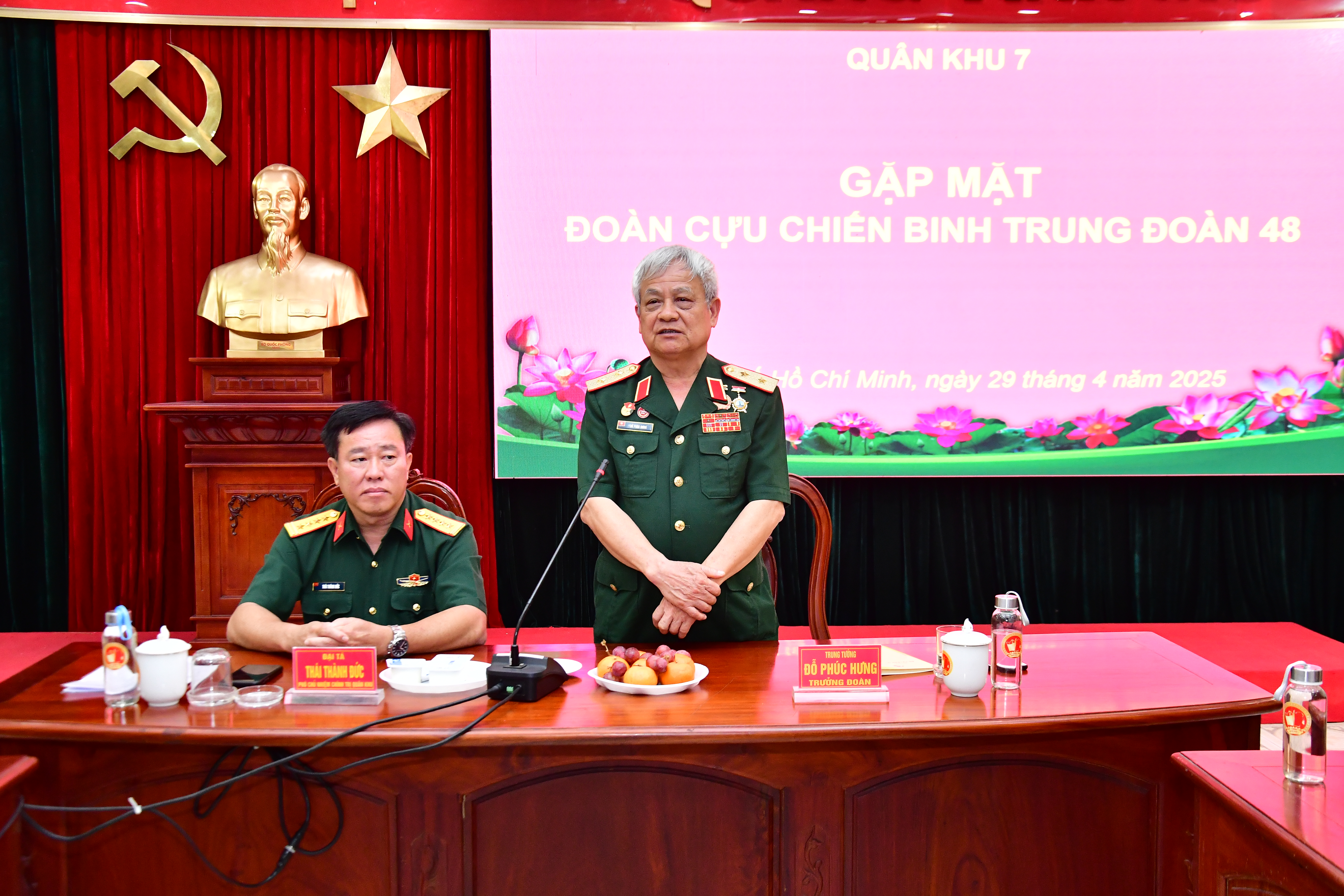 Thay mặt đoàn Cựu chiến binh Trung đoàn 48, Trung tướng Đỗ Phúc Hưng cám ơn Đảng ủy, Bộ Tư lệnh Quân khu đã đón tiếp và tạo mọi điều kiện thuận lợi để đoàn được thăm lại chiến trường xưa nhân dịp kỷ niệm 50 năm Ngày giải phóng miền Nam, thống nhất đất nước và bày tỏ vui mừng, phấn khởi trước sự trưởng thành, ngày càng phát triển lớn mạnh của LLVT Quân khu 7 và gửi lời chúc thủ trưởng Bộ Tư lệnh Quân khu cùng cán bộ, chiến sĩ LLVT Quân khu luôn mạnh khỏe, hạnh phúc, hoàn thành xuất sắc mọi nhiệm vụ được giao.