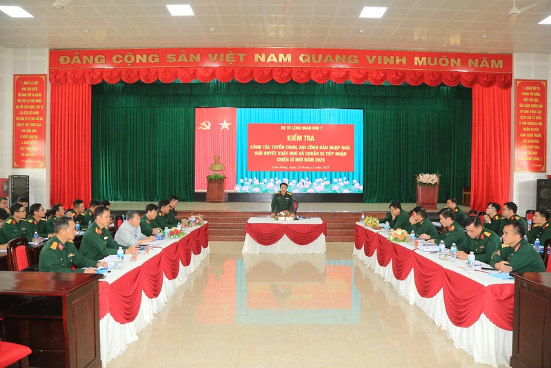 (QK7 Online) - Ngày 25/12, tại Ban Chỉ huy PTKV 1 - Đức Trọng, đoàn công tác Bộ Tư lệnh Quân khu 7 do Đại tá Nguyễn Hồng Cảnh, Phó Chủ nhiệm Chính trị Quân khu làm trưởng đoàn đến kiểm tra công tác tuyển chọn, gọi công dân nhập ngũ, giải quyết xuất ngũ và chuẩn bị tiếp nhận chiến sĩ mới (CSM) năm 2026 đối với Bộ CHQS tỉnh Lâm Đồng.