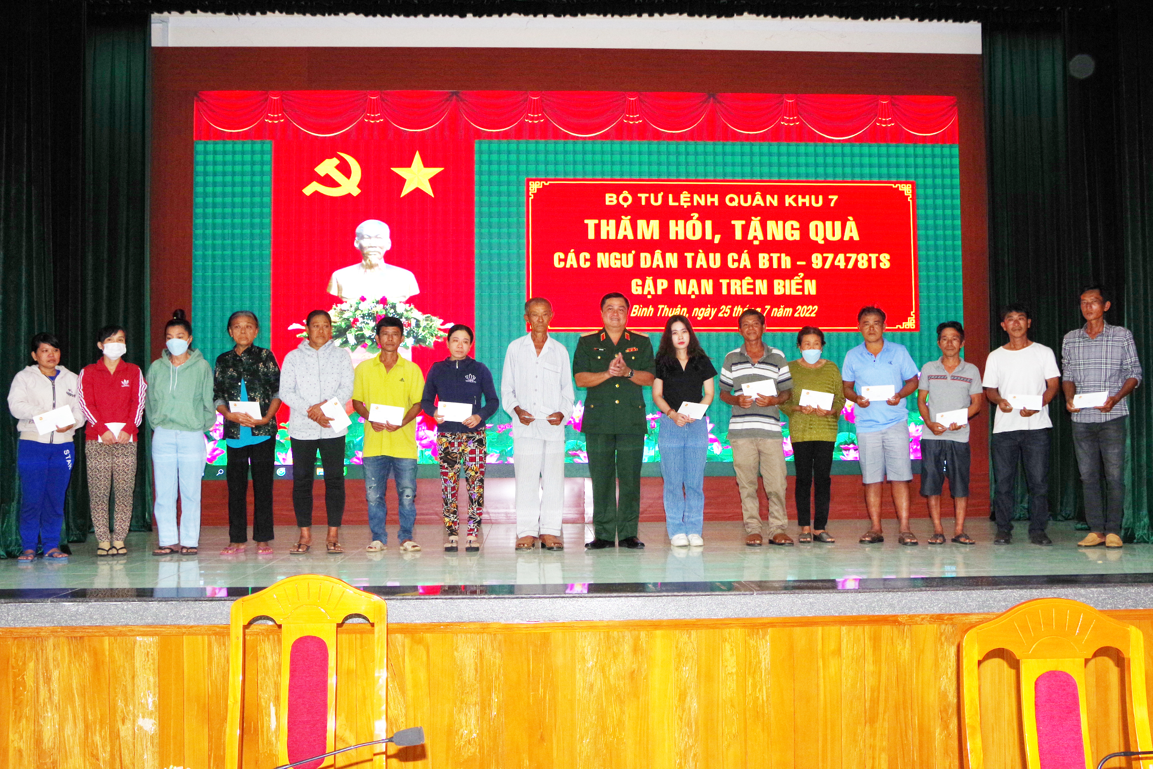 (QK7 Online) - Ngày 25-7, Thiếu tướng Đỗ Văn Bảnh, Phó Chính ủy Quân khu gặp mặt thăm hỏi, tặng quà động viên 15 gia đình ngư dân trên tàu cá BTh 97478TS tỉnh Bình Thuận bị nạn trên biển ngày 10-7.