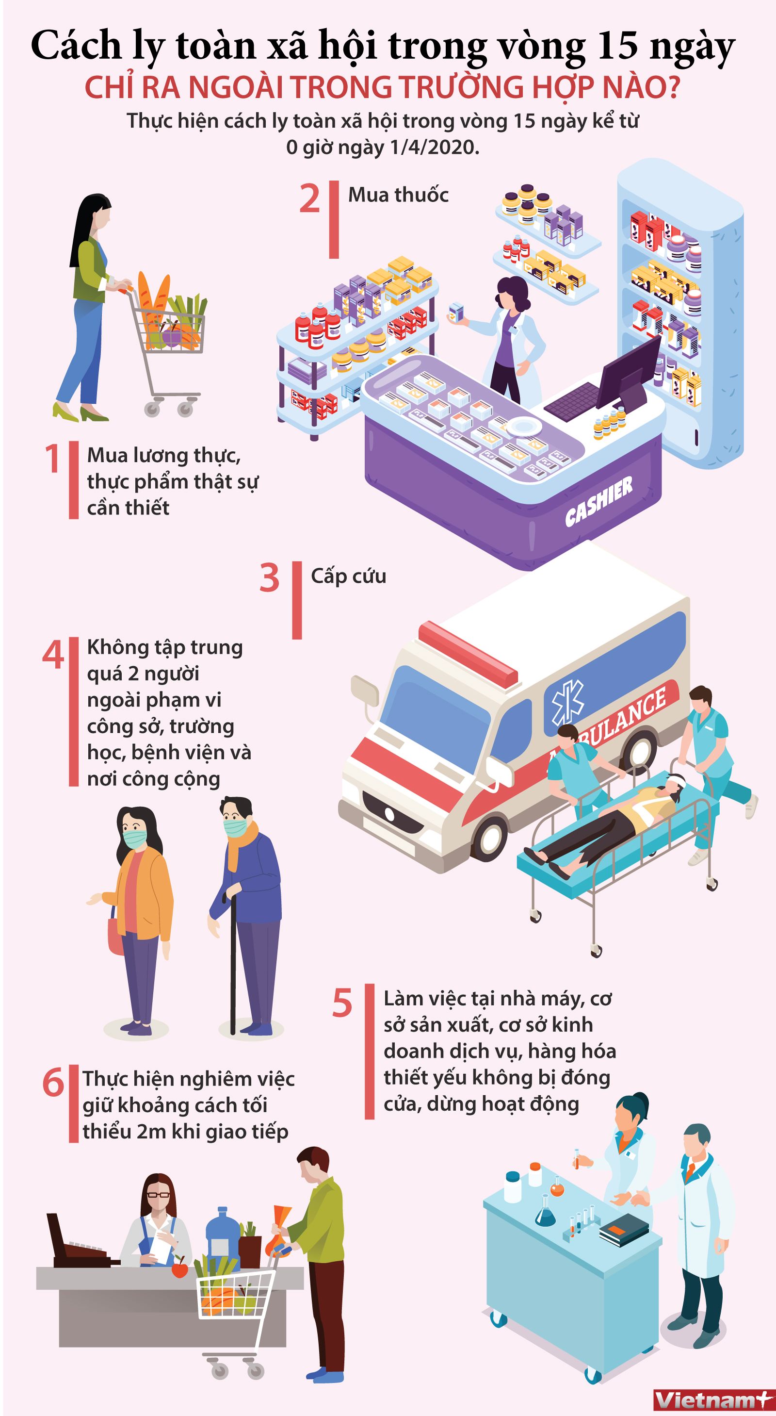 Ngày 31-3, Thủ tướng Chính phủ Nguyễn Xuân Phúc vừa ban hành Chỉ thị số 16/CT-TTg về thực hiện các biện pháp cấp bách phòng, chống dịch Covid-19. Cụ thể, thực hiện cách ly toàn xã hội trong vòng 15 ngày kể từ 0 giờ ngày 1-4-2020 trên phạm vi toàn quốc theo nguyên tắc gia đình cách ly với gia đình, thôn bản cách ly với thôn bản, xã cách ly với xã, huyện cách ly với huyện, tỉnh cách ly với tỉnh, phân xưởng, nhà máy sản xuất phải bảo đảm khoảng cách an toàn, đeo khẩu trang, thực hiện khử trùng, diệt khuẩn theo quy định. Yêu cầu mọi người dân ở tại nhà, chỉ ra ngoài trong trường hợp thật sự cần thiết như mua lương thực, thực phẩm, thuốc men, cấp cứu, làm việc tại nhà máy, cơ sở sản xuất, cơ sở kinh doanh dịch vụ, hàng hóa thiết yếu không bị đóng cửa, dừng hoạt động và các trường hợp khẩn cấp khác; thực hiện nghiêm việc giữ khoảng cách tối thiểu 2m khi giao tiếp; không tập trung quá 2 người ngoài phạm vi công sở, trường học, bệnh viện và tại nơi công cộng.