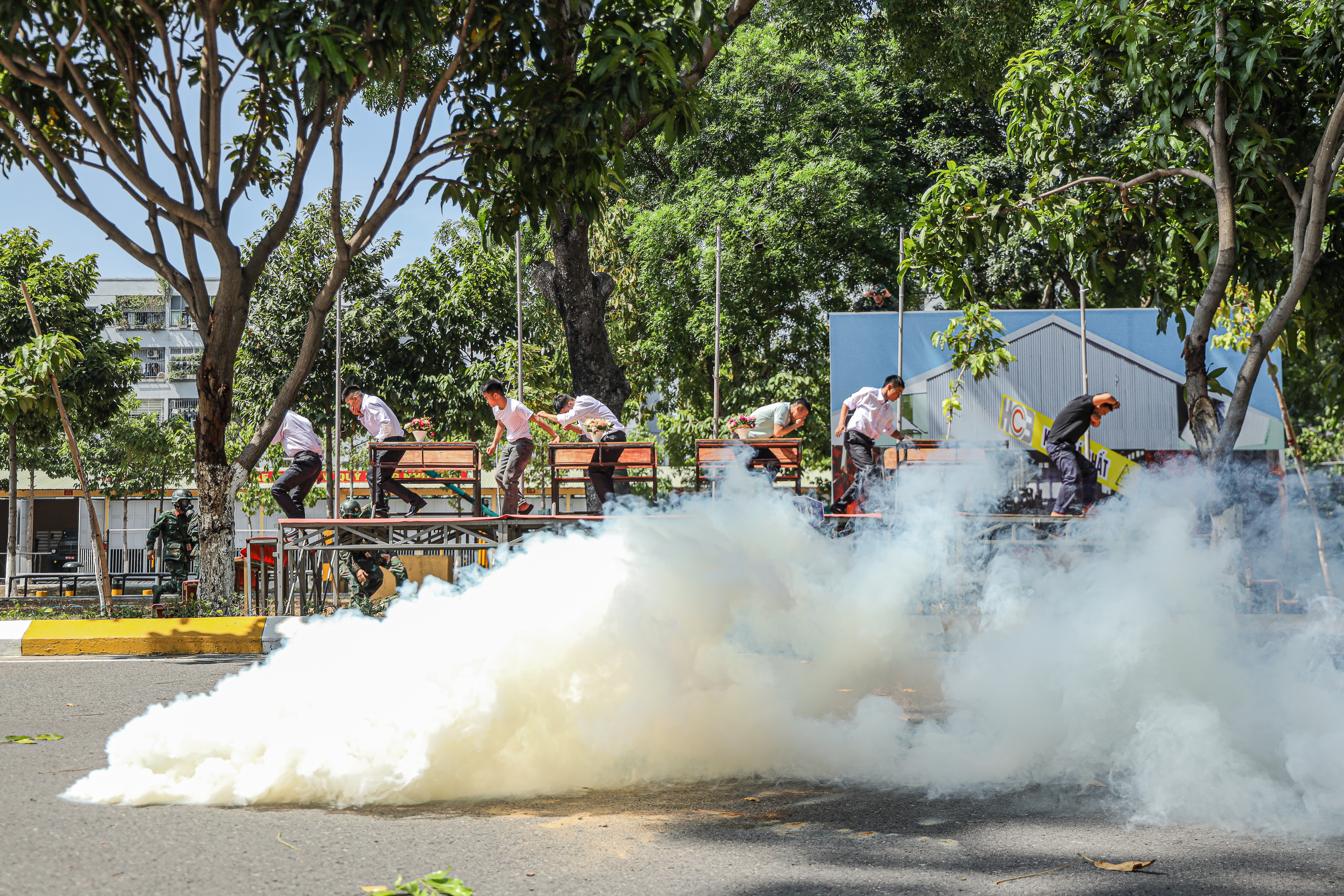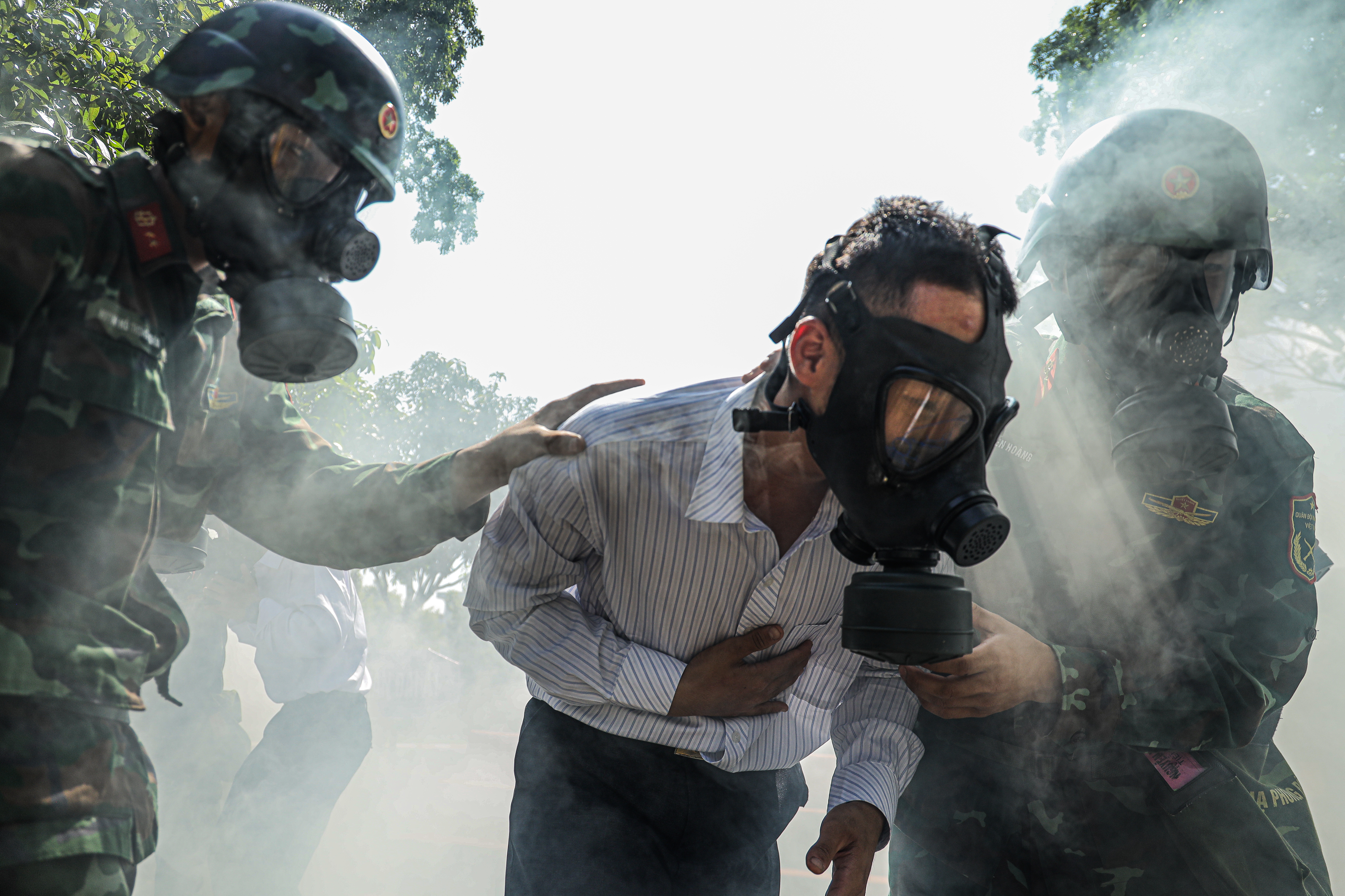 Khi có sự cố, bộ đội hóa học nhanh chóng cấp phát mặt nạ, đưa đại biểu và người dân đến nơi an toàn.