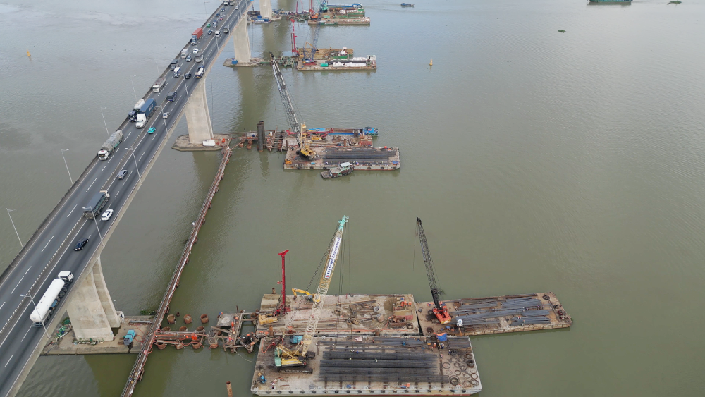 Sau hơn 2 tháng triển khai, công trường mở rộng cao tốc TP.HCM - Long Thành đang hình thành rõ nét với nhịp độ thi công liên tục từ phía TP.HCM đến cầu Long Thành (Đồng Nai). Cầu Long Thành dài 2,3km sẽ được xây thêm nhánh mới với quy mô 5 làn xe hoàn chỉnh theo chiều từ TP.HCM đi Long Thành, bên phải cầu hiện hữu. HIện nay, các trụ cầu mới đang được triển khai đồng loạt, hố móng và cọc khoan đã được hạ sâu xuống nền đất để chuẩn bị cho hạng mục cầu mở rộng.
