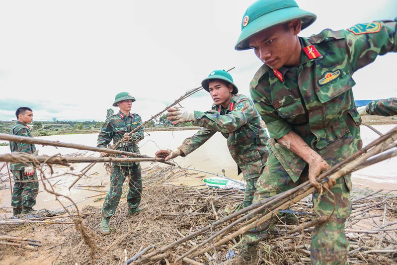 Cán bộ, chiến sĩ Lữ đoàn 25 giúp dân dọn dẹp đường sau khi nước lũ rút tại xã Cát Tiên, tỉnh Lâm Đồng.