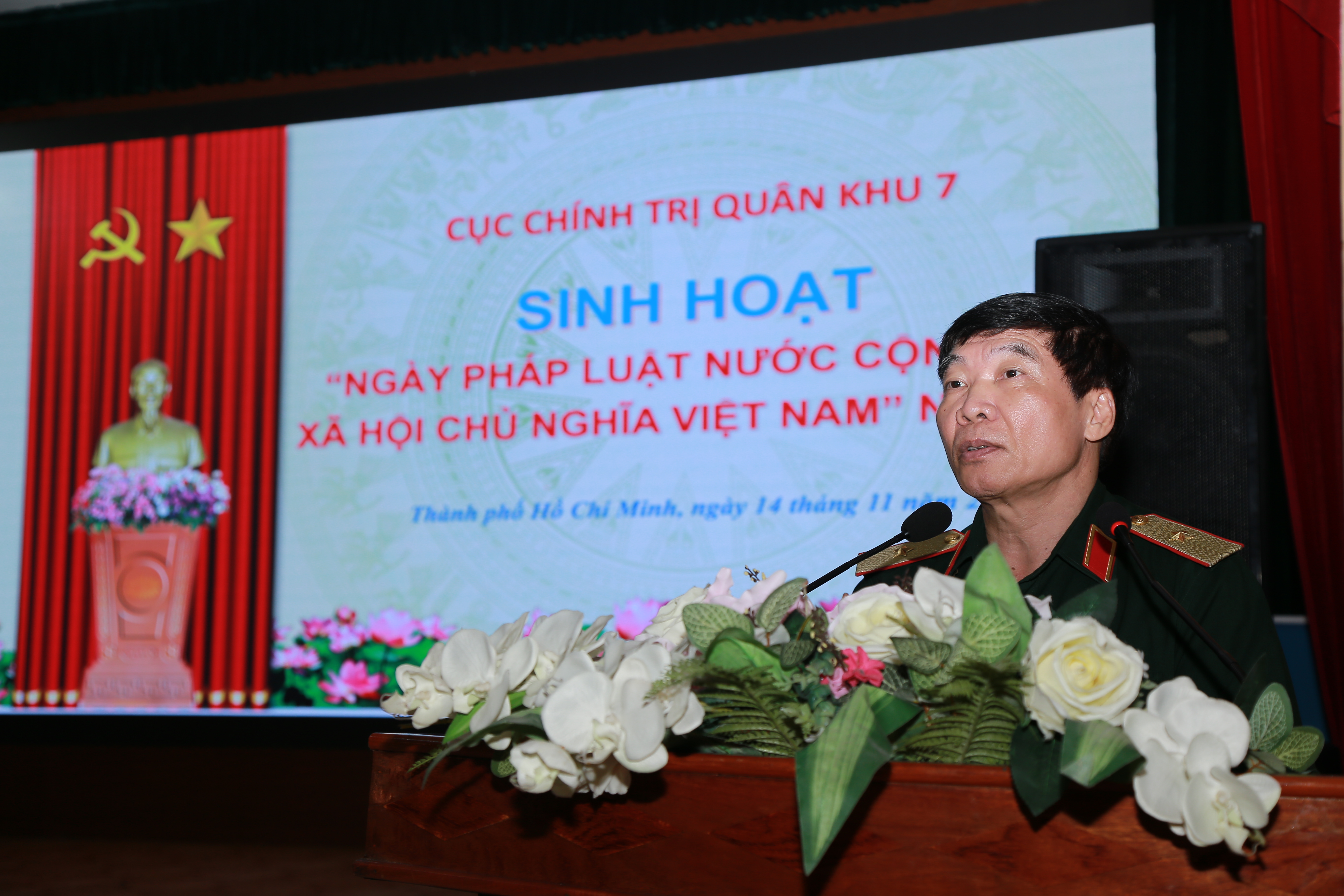 (QK7 Online) - Ngày 14/11, Cục Chính trị Quân khu 7 tổ chức Ngày Pháp luật Việt Nam năm 2022 với chủ đề “Nâng cao ý thức thượng tôn pháp luật, xây dựng cơ quan, đơn vị vững mạnh toàn diện “mẫu mực, tiêu biểu”, hoàn thành xuất sắc mọi nhiệm vụ được giao”. Thiếu tướng Nguyễn Văn Hiệu, Bí thư Đảng ủy Cục Chính trị, Phó Chủ nhiệm Chính trị Quân khu đến dự và phát biểu chỉ đạo.