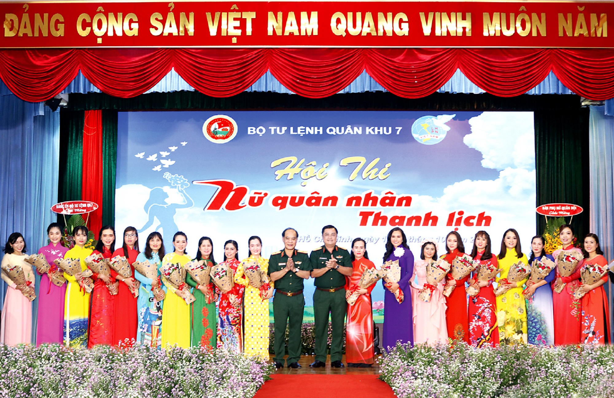 Thủ trưởng Bộ Tư lệnh Quân khu và Cục Chính trị tặng hoa các đơn vị tham gia hội thi Nữ quân nhân thanh lịch trong LLVT Quân khu năm 2020.