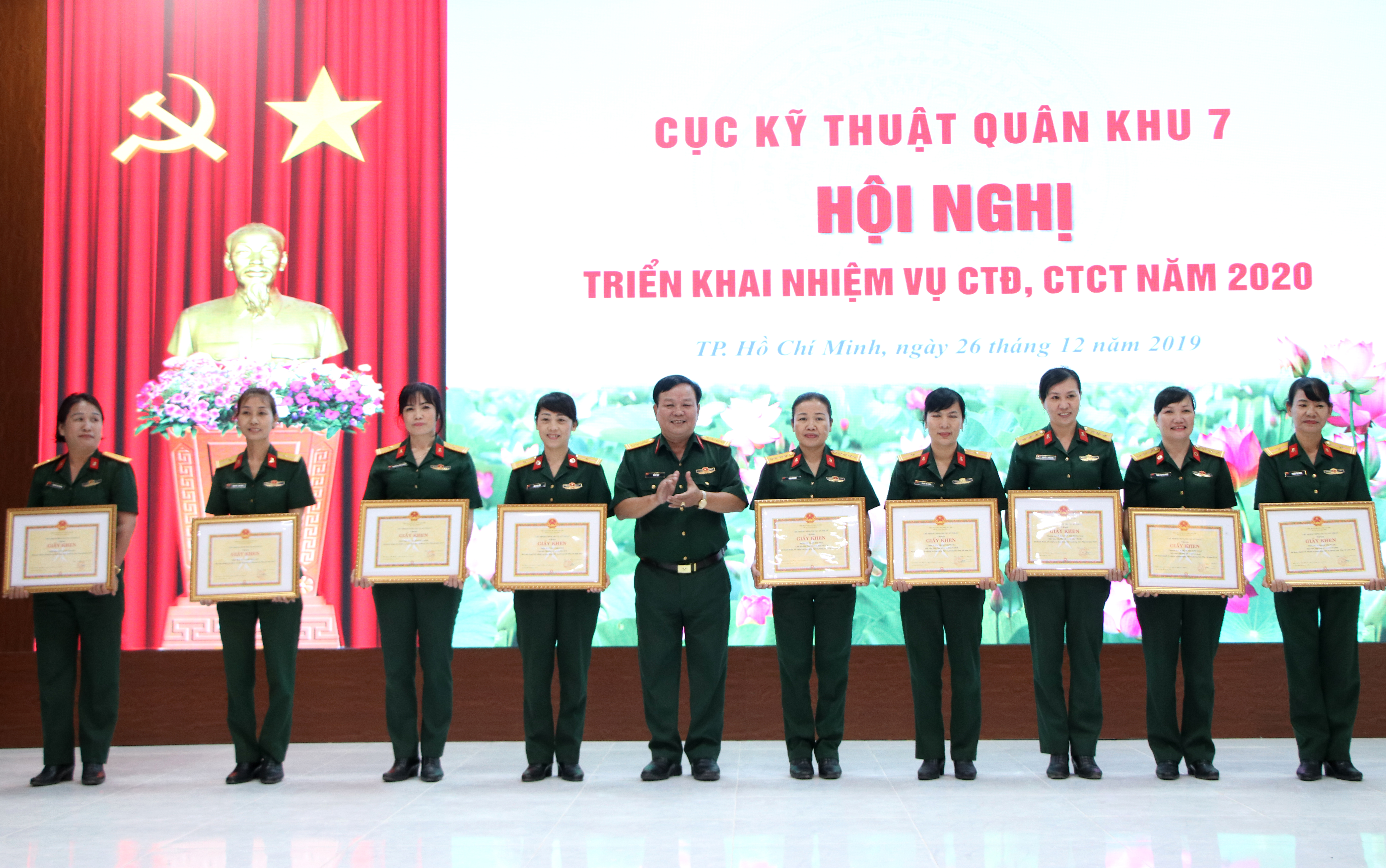 Đại tá Hồ Sỹ Quý, Chủ nhiệm Chính trị Cục Kỹ thuật trao tặng giấy khen cho các tập thể, cá nhân hoàn thành tốt nhiệm vụ trong hoạt động Đoàn thanh niên, Hội phụ nữ năm 2019.