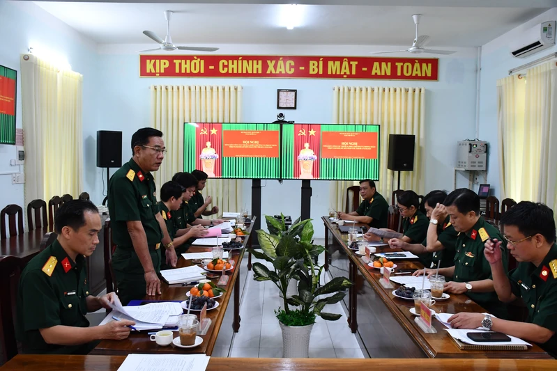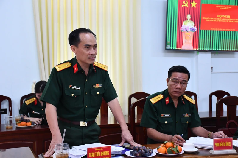 Thượng tá Trần Thái Khương, Ủy viên Thường vụ Đảng ủy, Chủ nhiệm Chính trị Bộ Tham mưu Quân khu phát biểu chỉ đạo tại hội nghị.
