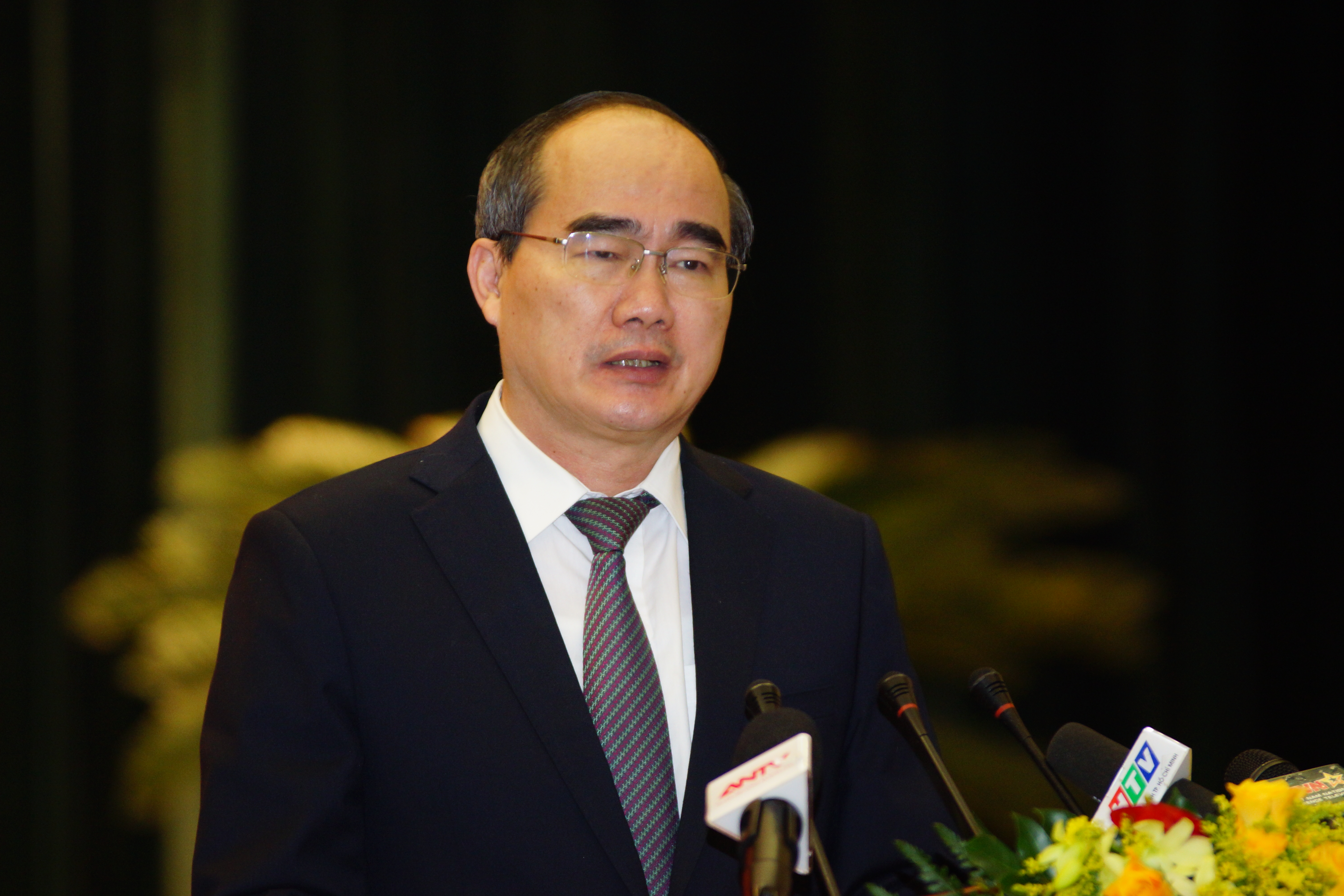 Đồng chí Nguyễn Thiện Nhân, Ủy viên Bộ Chính trị, Bí thư Thành ủy Thành phố Hồ Chí Minh trình bày tham luận