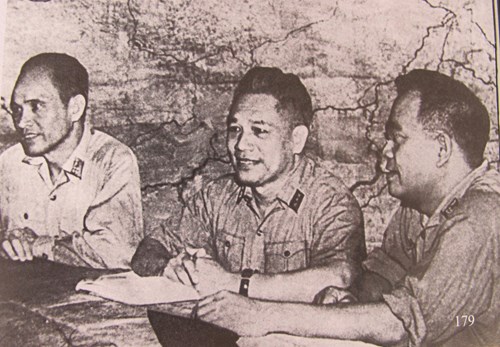 Đồng chí Văn Tiến Dũng (ngồi giữa) chỉ đạo tác chiến tại Sở Chỉ huy Quân chủng Phòng không-Không quân, tháng 11-1972. Ảnh tư liệu