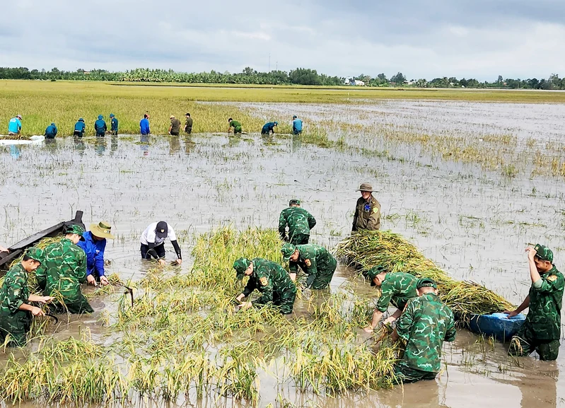 Cán bộ, chiến sĩ BĐBP tỉnh giúp Nhân dân thu hoạch lúa bị ngập nặng.