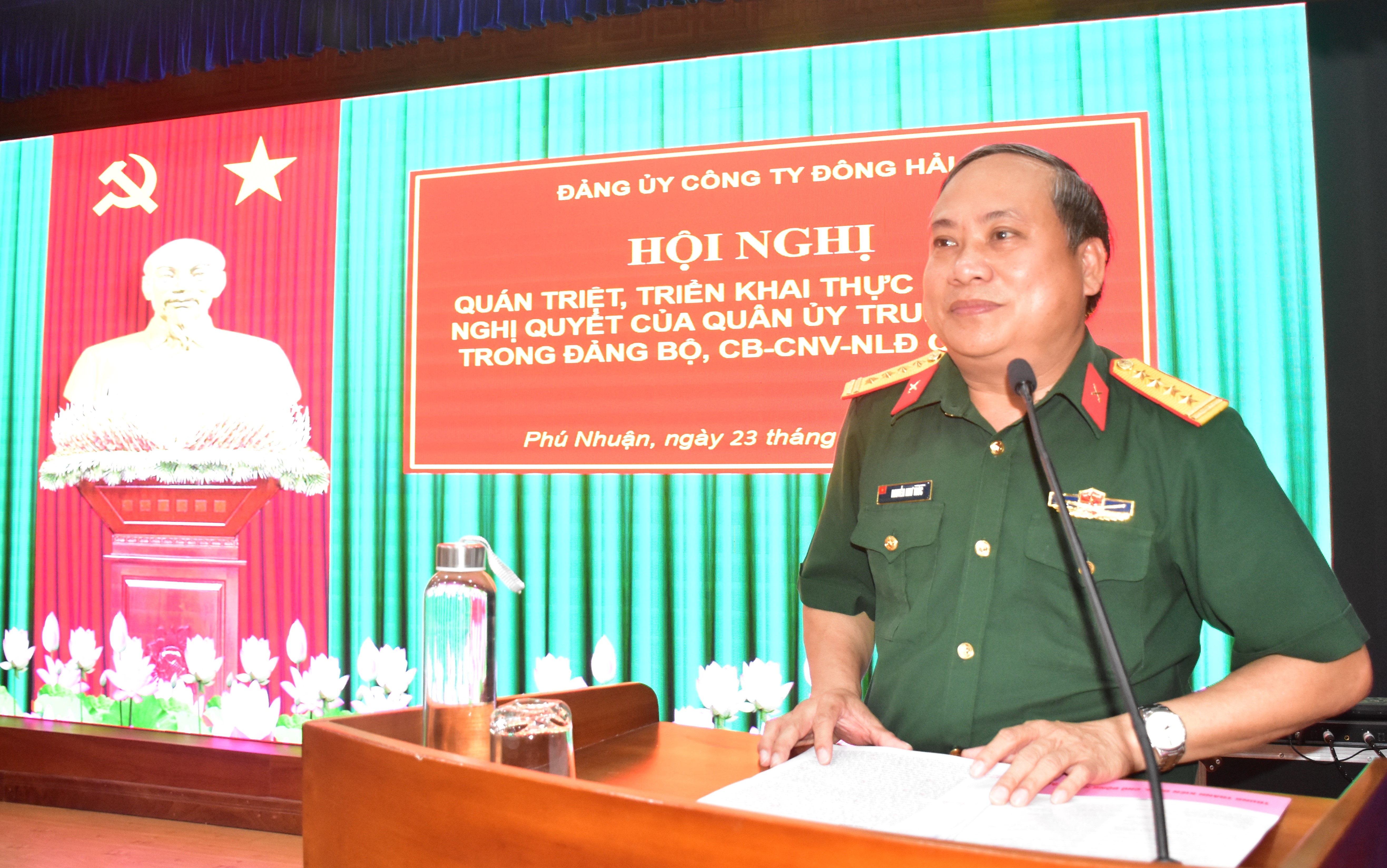 (QK7 Online) - Ngày 23-3, Đảng ủy Công ty Đông Hải tổ chức học tập, quán triệt, triển khai thực hiện các Nghị quyết của Quân ủy Trung ương. Đại tá Trần Văn Hoan, Bí thư Đảng ủy, Chủ tịch Công ty chủ trị hội nghị.