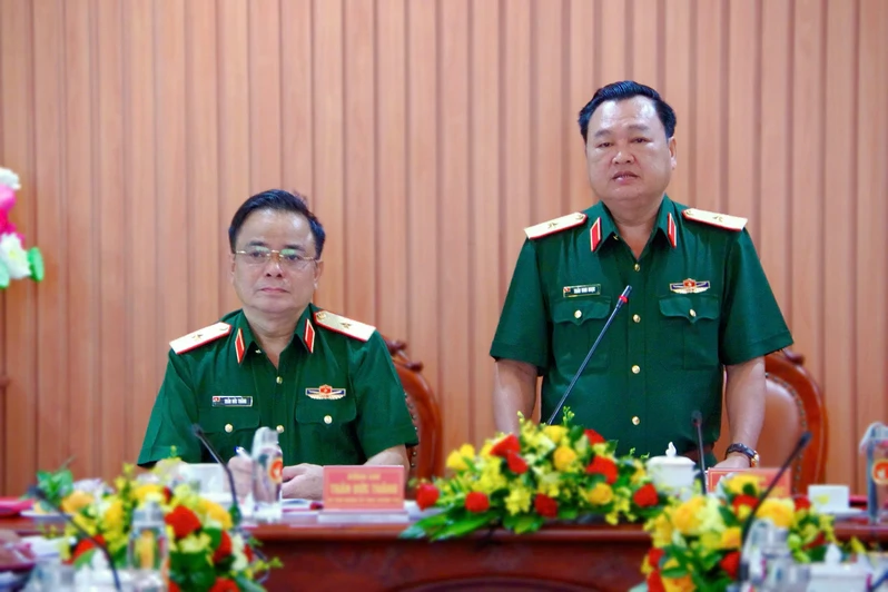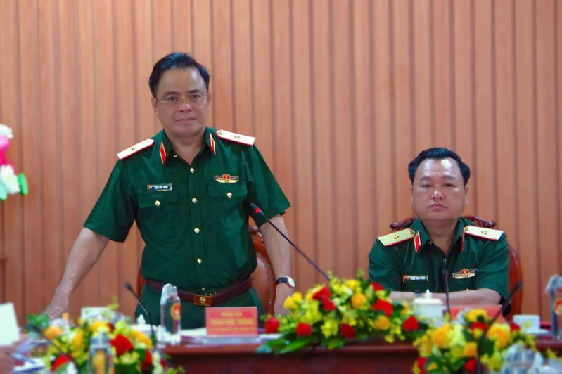 Thiếu tướng Trần Vinh Ngọc, Bí thư Đảng ủy, Chính ủy Quân khu 7 phát biểu chỉ đạo tại hội nghị.