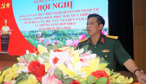 (QK7 Online) – Ngày 25/10/2019, Đảng ủy Quân khu 7 tổ chức sơ kết 5 năm thực hiện Nghị quyết 689 của Quân ủy Trung ương về phòng, chống, khắc phục hậu quả thiên tai, thảm họa, cứu hộ, cứu nạn (giai đoạn 2014 – 2019) và những năm tiếp theo. Trung tướng  Trần Hoài Trung, Bí thư Đảng ủy, Chính ủy Quân khu chủ trì hội nghị.