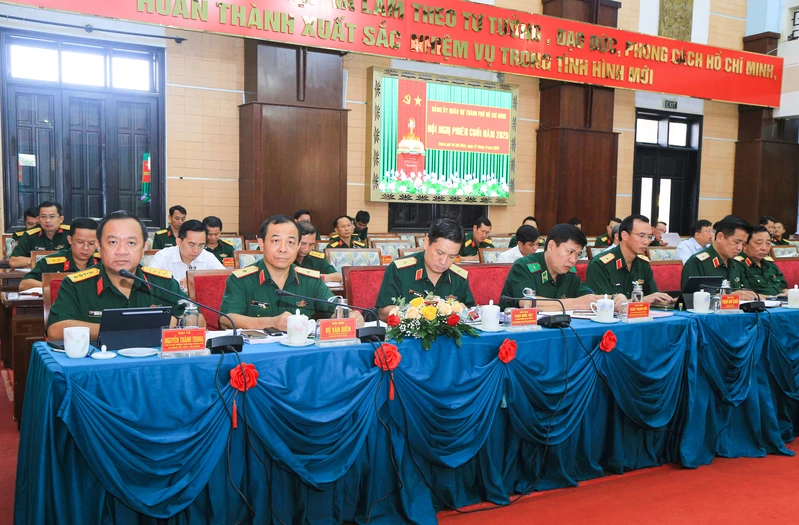 Phát biểu chỉ đạo hội nghị, Thiếu tướng Lê Xuân Thế, Phó Bí thư Đảng ủy, Tư lệnh Quân khu 7 đề nghị Đảng ủy Quân sự TPHCM tiếp tục quán triệt sâu sắc và triển khai thực hiện nghiêm túc, hiệu quả Nghị quyết Đại hội đại biểu toàn quốc lần thứ XIV của Đảng, Nghị quyết Đại hội Đảng bộ Quân đội, Quân khu, Thành phố nhiệm kỳ 2025 - 2030. Chủ động nắm chắc, nghiên cứu, dự báo, đánh giá đúng tình hình; duy trì nghiêm SSCĐ, tìm kiếm cứu hộ - cứu nạn; sẵn sàng lực lượng, phương tiện, phương án phòng, chống khắc phục hậu quả thiên tai, dịch bệnh, tham gia đấu tranh bảo vệ chủ quyền biển, đảo; giữ vững an ninh chính trị, trật tự an toàn xã hội trên địa bàn; phát huy tốt vai trò của lực lượng biên phòng kiểm soát chặt chẽ an ninh cảng biển. Nghiên cứu tham mưu với Thành ủy, UBND Thành phố các giải pháp lãnh đạo, chỉ đạo xây dựng nền quốc phòng toàn dân vững mạnh, hiện đại, trọng tâm: Đầu tư kinh phí xây dựng sở chỉ huy, căn cứ hậu phương, căn cứ hậu cần - kỹ thuật; xây dựng lực lượng DQTV, DBĐV đúng luật, có độ tin cậy chính trị và khả năng huy động cao; hoàn thành công tác tuyển chọn và gọi công dân nhập ngũ năm 2026 kết hợp đẩy mạnh hướng nghiệp tuyển sinh quân sự, bố trí việc làm cho quân nhân xuất ngũ và quản lý, sử dụng hiệu quả đảng viên xuất ngũ; nâng cao chất lượng hoạt động của Ban Chỉ huy PTKV, Ban CHQS cấp xã cũng như triển khai thực hiện giai đoạn 2 Đề án “Xây dựng Hải đội DQTT tham gia bảo vệ chủ quyền biển, đảo trong tình hình mới”…
