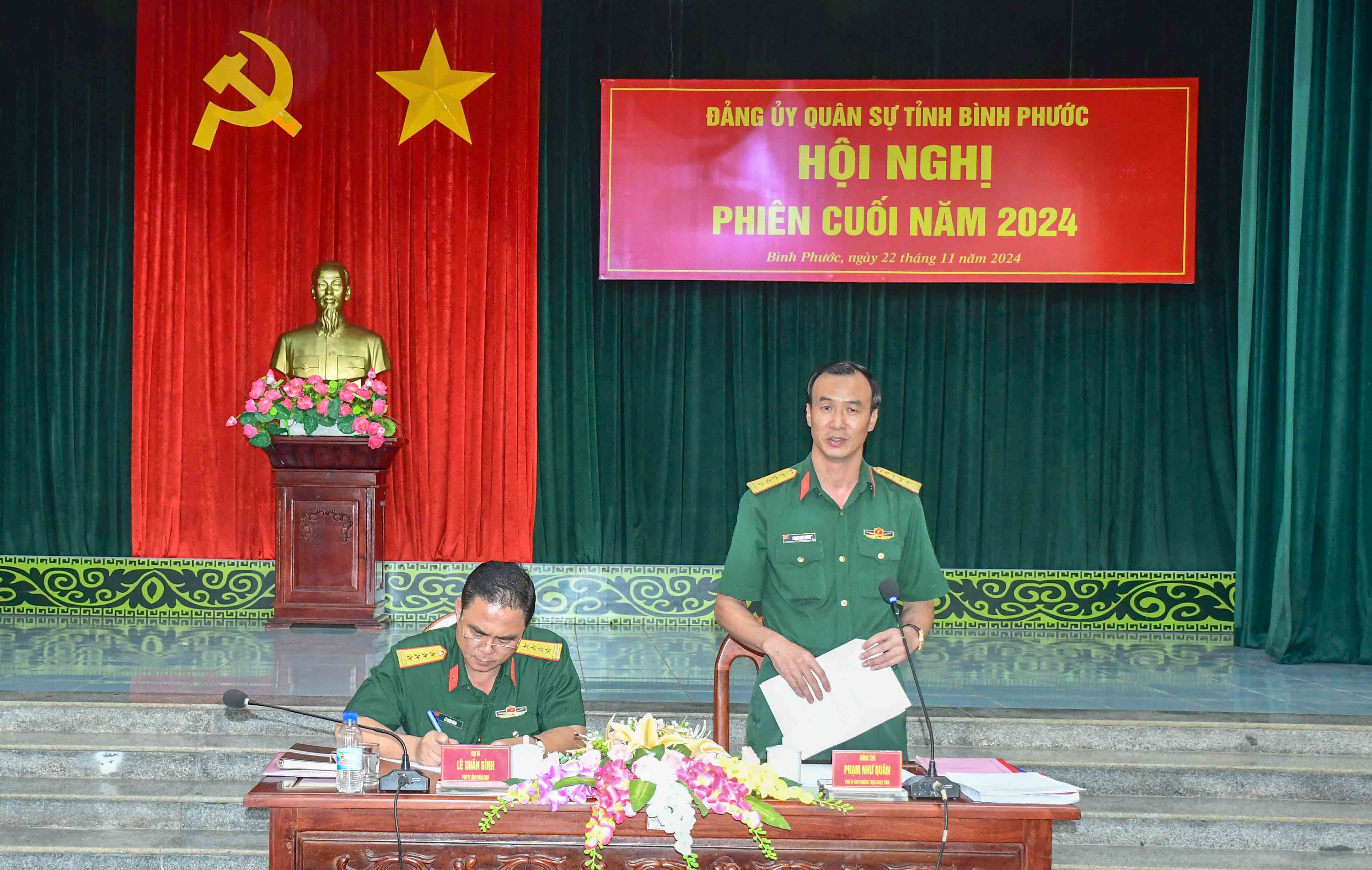 (QK7 Online) - Ngày 22/11, Đảng ủy Quân sự tỉnh Bình Phước tổ chức hội nghị phiên cuối năm 2024 ra Nghị quyết lãnh đạo thực hiện nhiệm vụ năm 2025. Đến dự và phát biểu chỉ đạo hội nghị có Đại tá Lê Xuân Bình, Phó Tư lệnh Quân khu 7; Đại tá Phạm Như Quân, Phó Bí thư thường trực Đảng ủy Quân sự tỉnh, Chính ủy Bộ CHQS tỉnh chủ trì hội nghị. Dự hội nghị có các đồng chí Ủy viên Ban TVTU; lãnh đạo các huyện, thị xã, thành phố.
