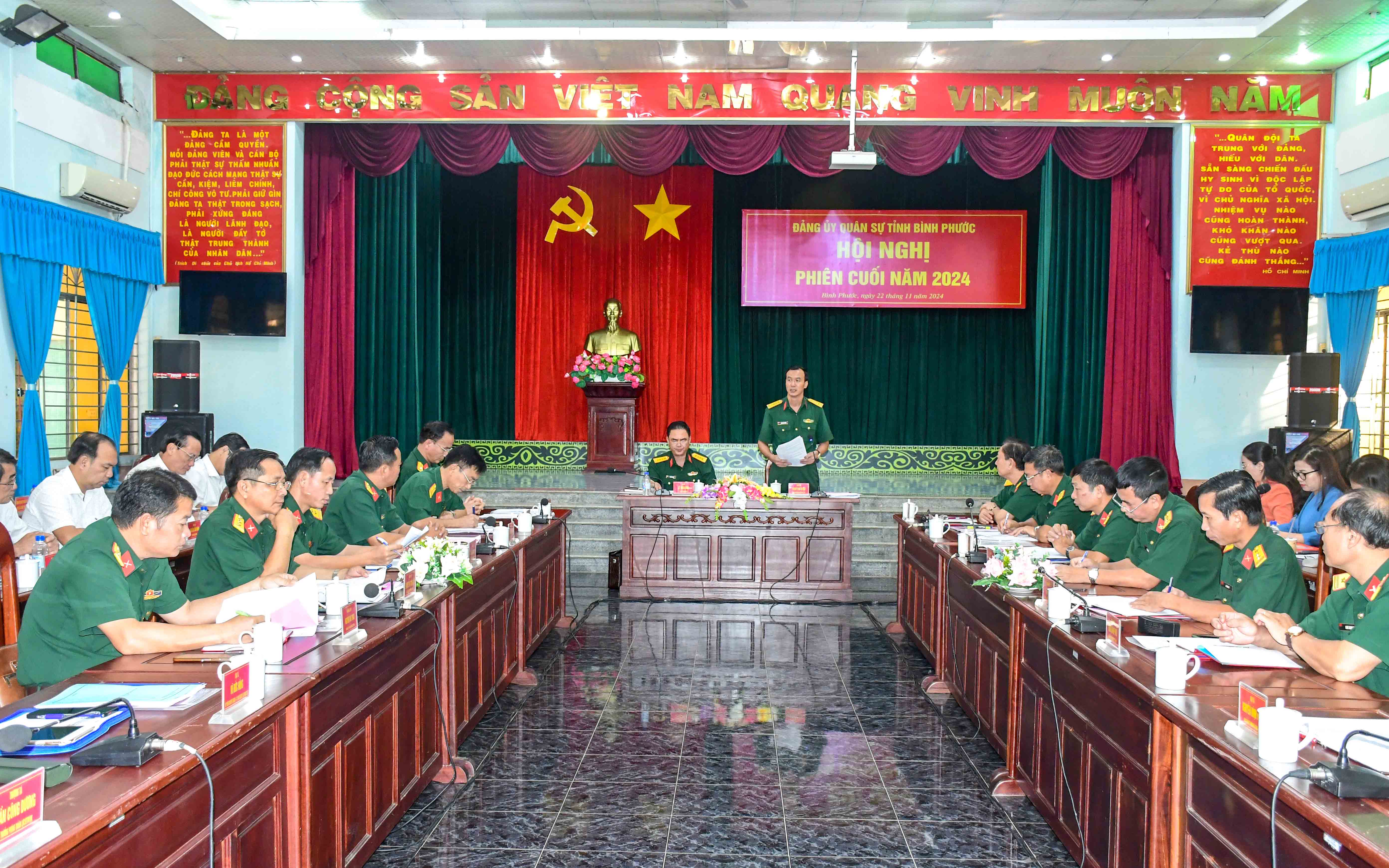 Năm 2024, bám sát sự lãnh đạo, chỉ đạo của Đảng ủy, Bộ Tư lệnh Quân khu 7, trực tiếp là Tỉnh ủy, HĐND, UBND tỉnh, Đảng ủy Quân sự tỉnh Bình Phước đã lãnh đạo, chỉ đạo triển khai hoàn thành toàn diện nhiệm vụ quốc phòng, quân sự địa phương (QP, QSĐP); duy trì nghiêm chế độ trực sẵn sàng chiến đấu; bảo đảm an ninh, an toàn các dịp lễ, tết, sự kiện chính trị của đất nước, địa phương. Chuẩn bị đầy đủ phương án, trang bị, phương tiện, tổ chức luyện tập phòng, chống thiên tai, tìm kiếm cứu nạn, tham gia xử lý hiệu quả các tình huống, không để bị động, bất ngờ. Lãnh đạo tiến hành đồng bộ các giải pháp trong công tác huấn luyện, giáo dục, đào tạo cho các đối tượng đúng, đủ nội dung chương trình, bảo đảm an toàn. Công tác hội thi, hội thao được cấp ủy, chỉ huy quan tâm, đạt kết quả tốt. Công tác xây dựng đơn vị VMTD “Mẫu mực, tiêu biểu”, “Xây dựng đơn vị điểm về huấn luyện điều lệnh, xây dựng chính quy, quản lý kỷ luật” có nhiều chuyển biến tích cực.