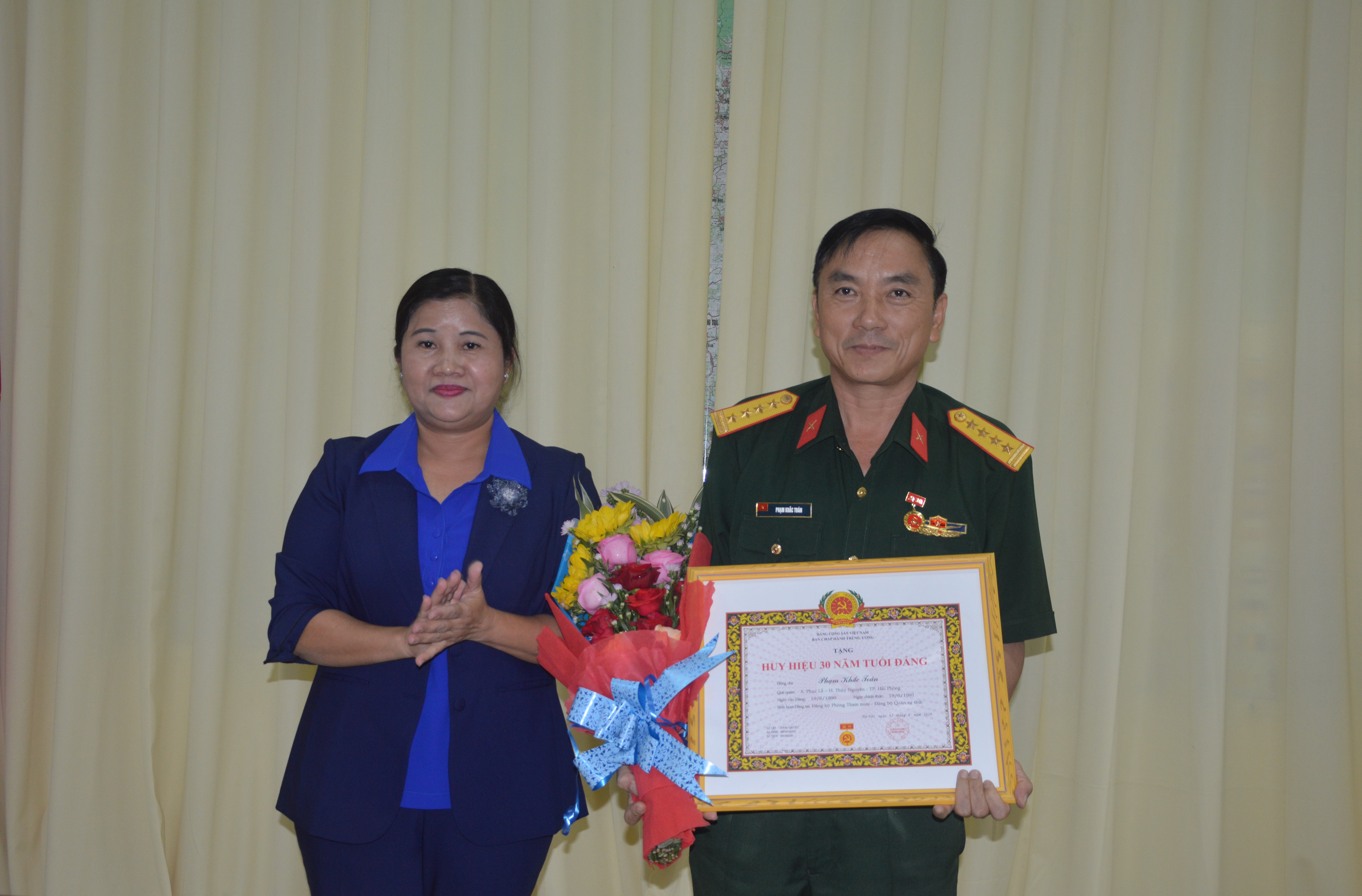 Đồng chí Trần Tuệ Hiền, Phó Bí thư Đảng ủy Quân sự, Chủ tịch UBND tỉnh trao tặng Huy hiệu 30 năm tuổi Đảng, hoa chúc mừng đảng viên Phạm Khắc Toán.
