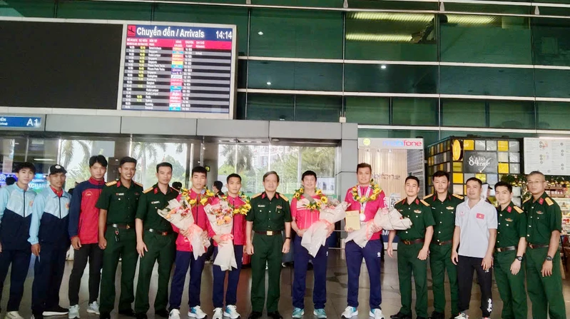 Ban Giám đốc Trung tâm TDTT Quốc phòng II đón, chúc mừng các vận động viên tại sân bay Tân Sơn Nhất.